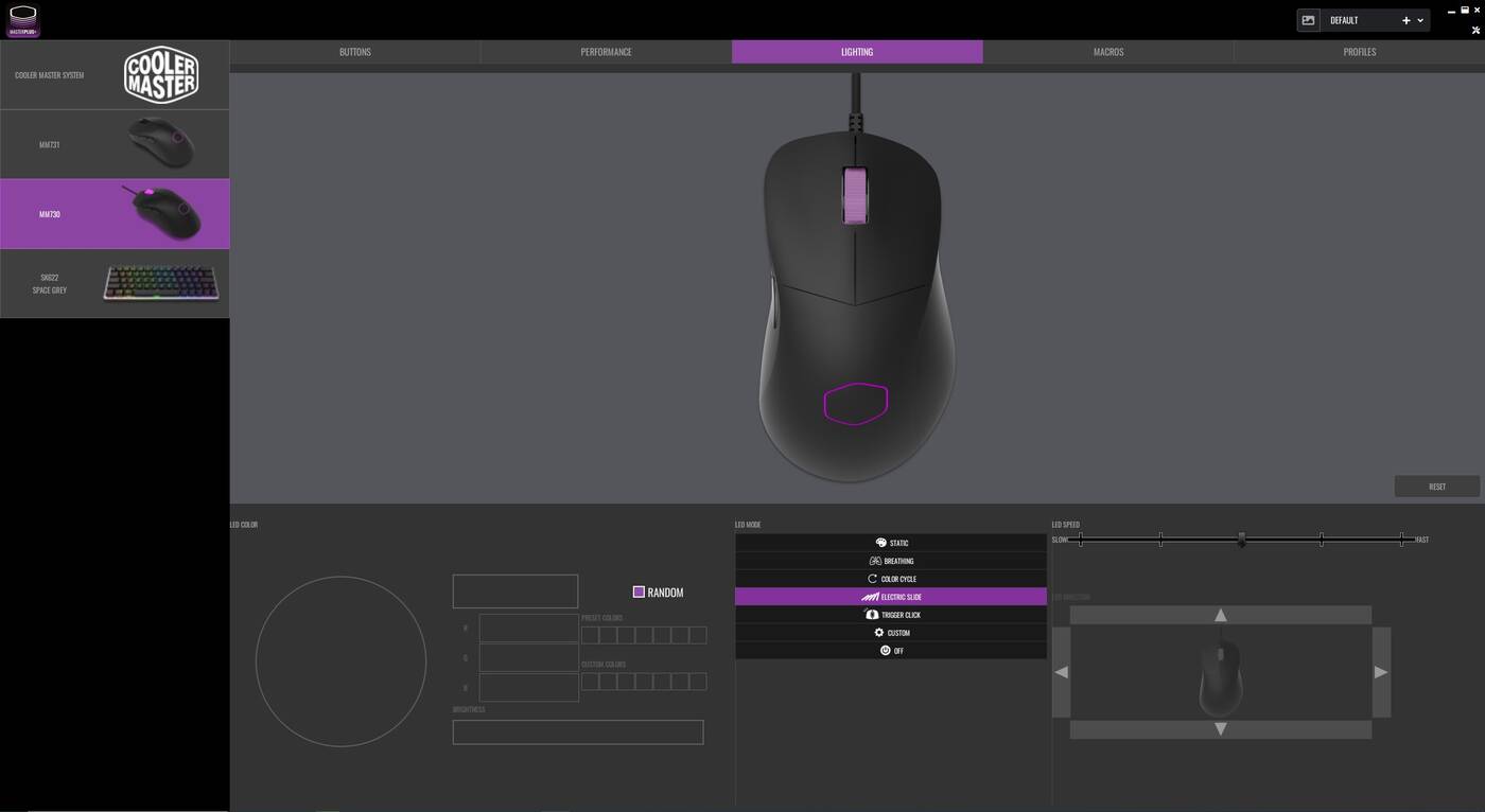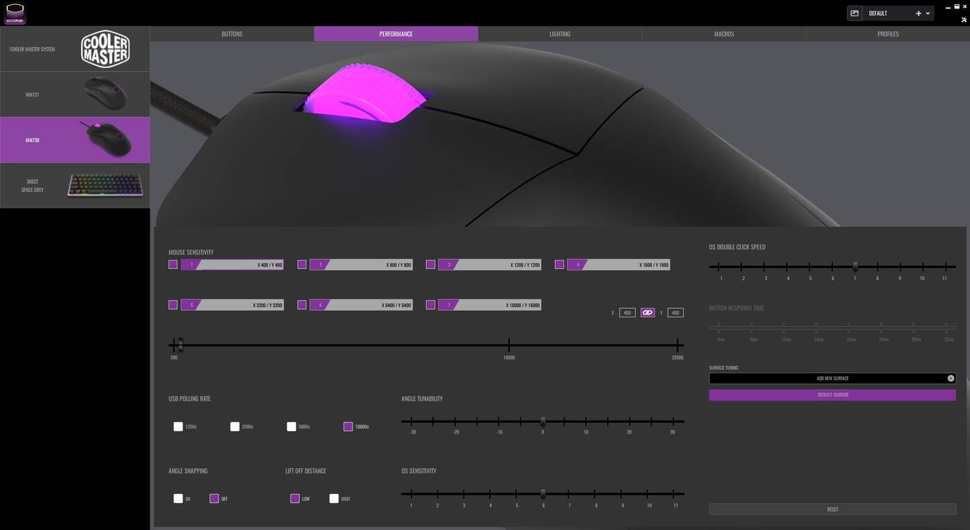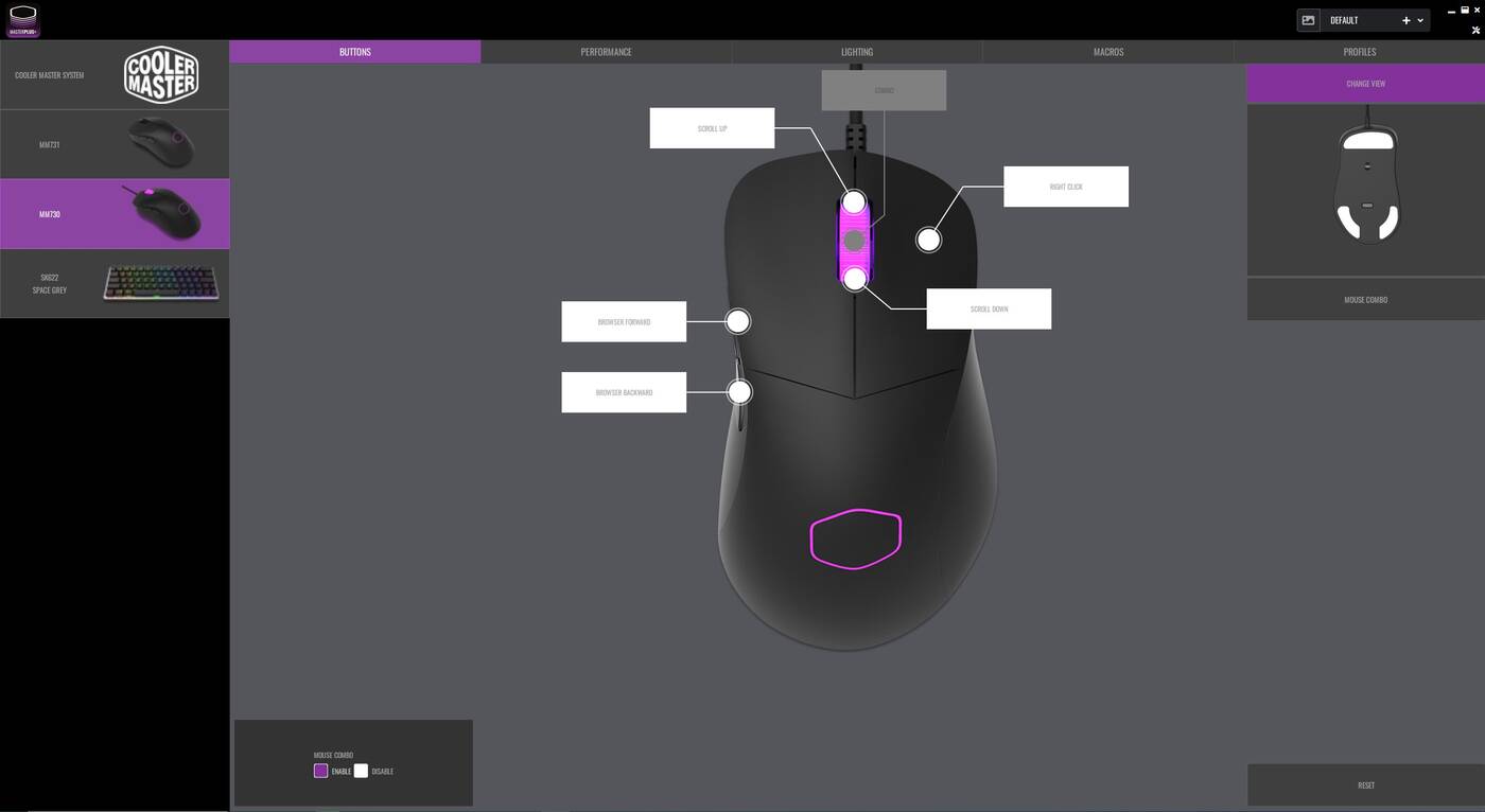 Wspierający MM730 program MasterPlus+ do pobrania z sieci stanowi HUB dla większości nowych sprzętów Cooler Mastera. Przy oferowaniu tradycyjnych funkcji, jak to zwykle z aplikacjami do myszek bywa, przykuwa jednak wzrok opcją Mouse-Combo dla zwiększenia liczby funkcji przycisków poprzez kombinację z wciśniętą rolką, funkcją kalibracji myszki pod daną podkładkę, ustawienia parametru LOD i predykcji, jak również tworzenia zaawansowanych makr.