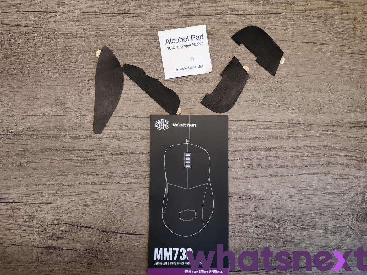 Mysz MM730 trafia do nas w małym kartonowym pudełeczku, które skrywa tekturową osłonkę, odpowiadającą razem z kawałkiem folii za bezpieczeństwo produktu w transporcie. Oprócz samej myszki i zintegrowanego z nią przewodu, dostajemy też kartę produktu, chusteczkę nasączoną alkoholem i cztery gumowe, dobrej jakości nakładki do opcjonalnego przyklejenia na obudowę.