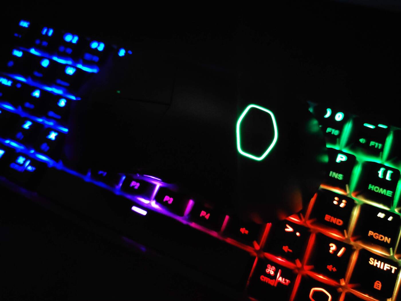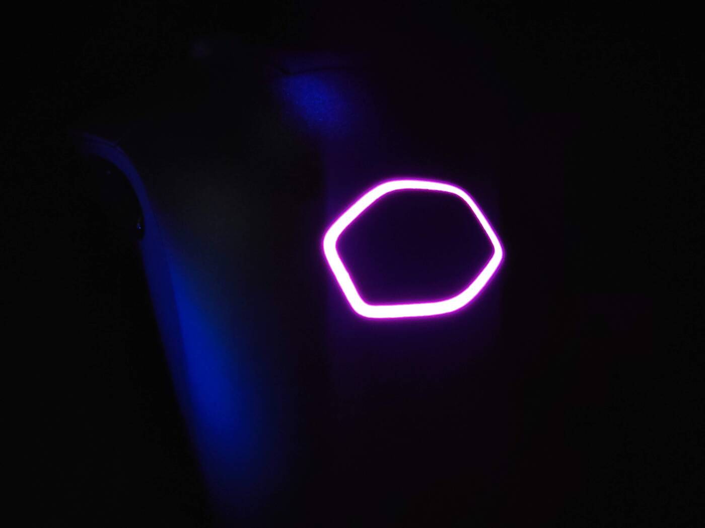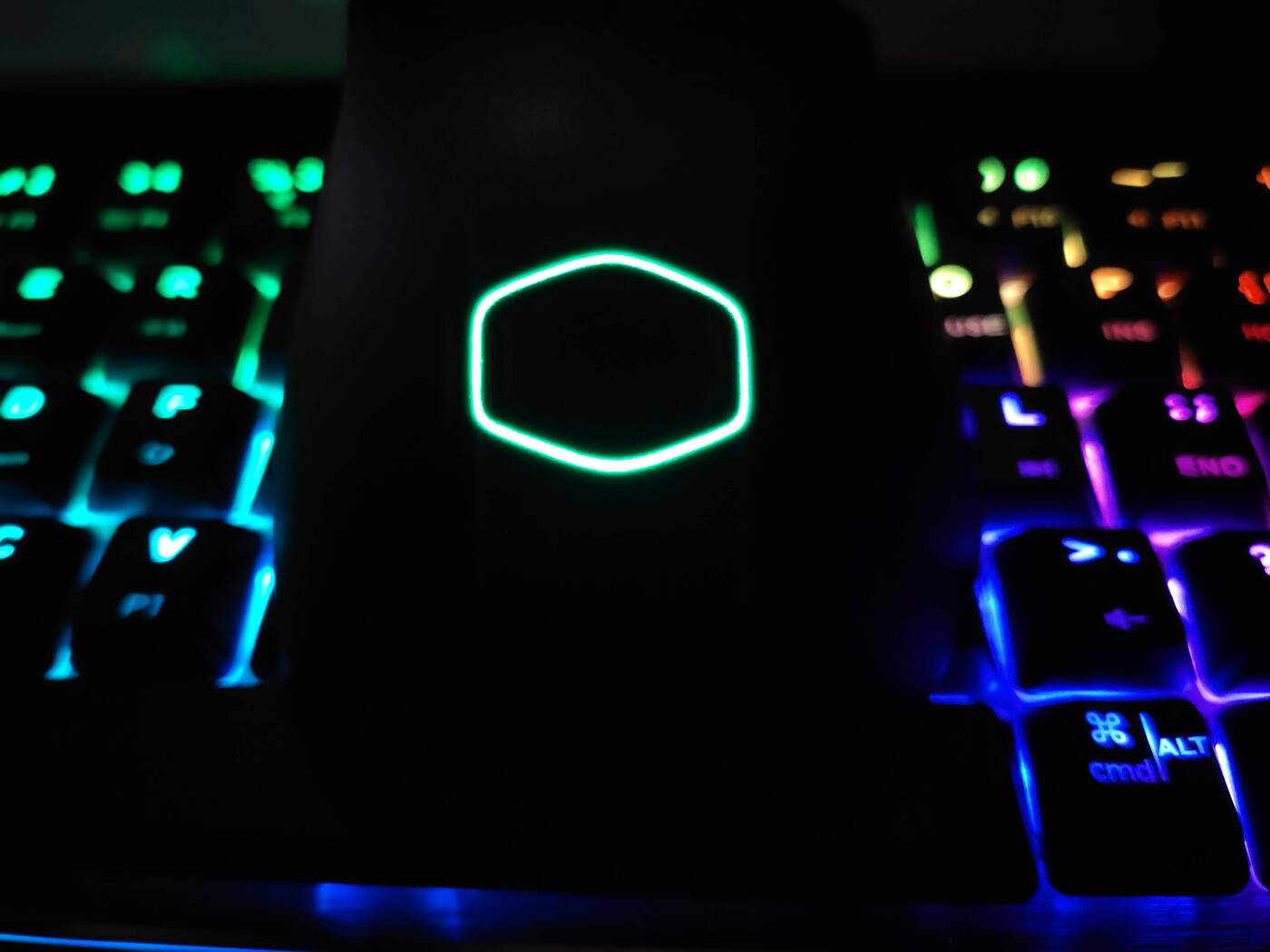 Lewy panel posiada znaczące wgłębienie, aby lepiej gościć kciuk użytkownika, podczas gdy prawy sięgnął po przedłużoną tylną sekcję, zapewniającą lepsze oparcie dla małego i serdecznego palca. Grzbiet jest z kolei dosyć standardowy i szybko wzbija się na maksymalną wysokość 39,1 mm, aby zapewnić oparcie wnętrzu dłoni. Ostatni przejaw dbałości o komfort sprowadza się do skrzydełek głównych przycisków, a jeśli idzie o kwestię designu, to ten uzupełnia tylko podświetlany kształt logo Cooler Mastera na grzbiecie. Tego ukryto nie pod mleczną wstawką, a taką przydymioną, przez co tylko aktywacja podświetlenia zdradza jej obecność.