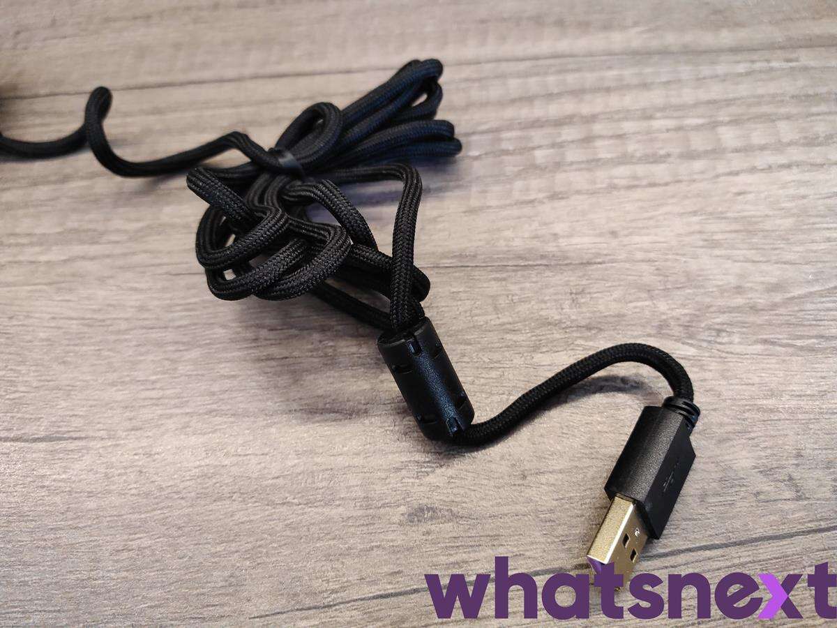 Pod pozostałymi względami MM730 jest już standardowa. Posiada zintegrowany przewód Ultraweave w materiałowym oplocie świetnej jakości, którego docenią wszyscy, którzy choć raz walczyli ze zbyt sztywnym, ciężkim przewodem myszki. Nie zabrakło też rolki z gumową nakładką, dwóch przycisków bocznych wykonanych ze śliskiego plastiku, czy ślizgaczy na spodzie. Towarzyszy im jeden prosty przycisk do zmiany DPI, którego funkcję można podmienić oraz sensor umiejscowiony nie w centrum, a dobry centymetr poza środkiem podstawy myszki.