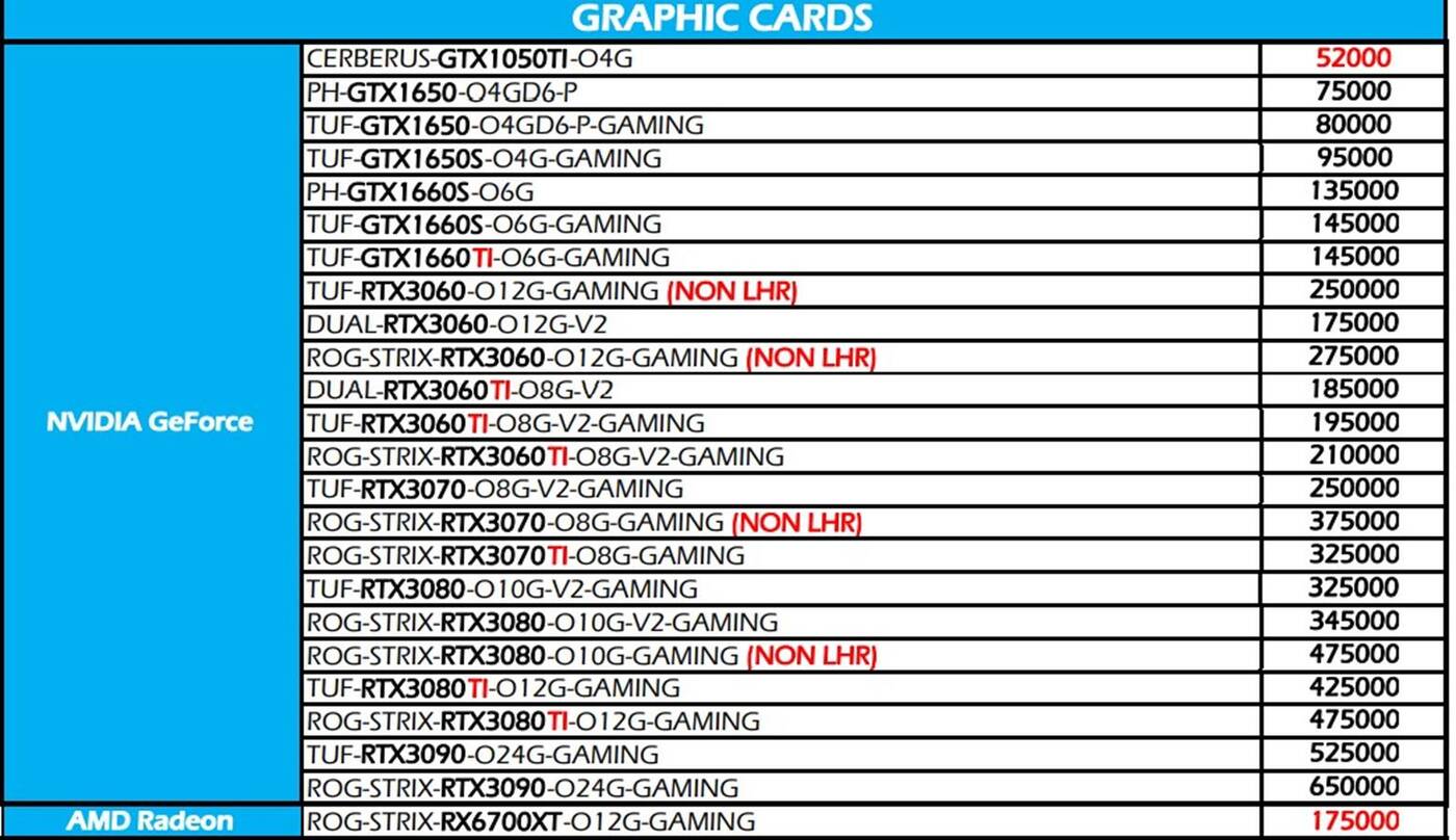 Kupujący te karty sprzedawcy detaliczni otrzymują zniżkę rzędu 100/150 zł, ale i tak sprzedają je następnie klientom prywatnym w cenie ponad 3000 zł, chcąc mieć swój udział w zyskach. Z kolei firma ASUS udostępniając swojemu oficjalnemu dystrybutorowi Pacific Computers w Pakistanie cennik najnowszych kart graficznych, w którym to wzrok przykuwa najbardziej GeForce GTX 1660 Ti, objęty gwarancją i zupełnie nowy, ale w cenie… 3400 zł. Jego cena w sklepie będzie jeszcze wyższa.