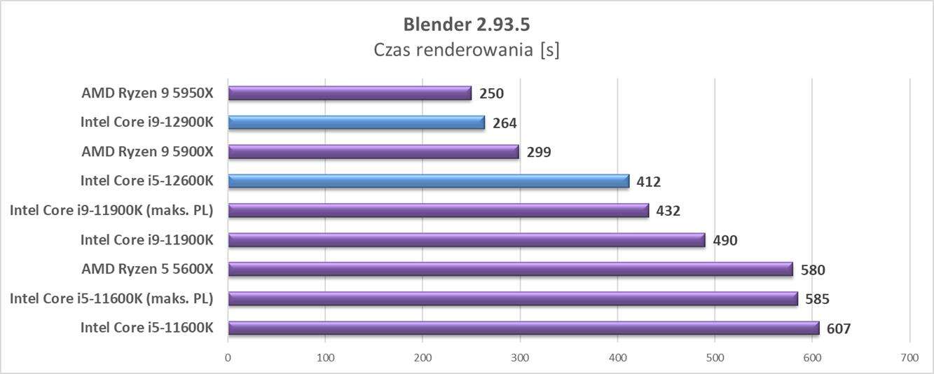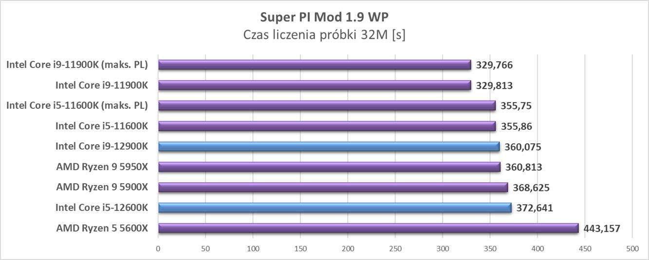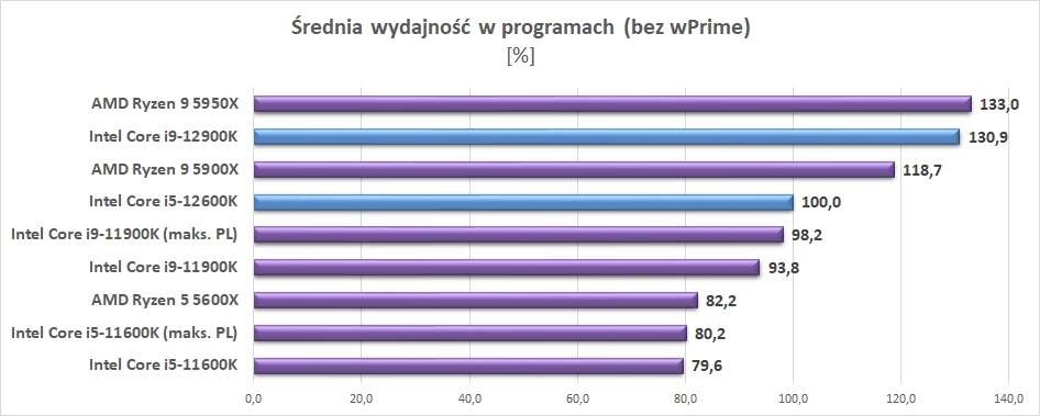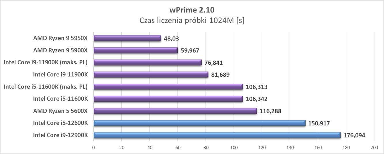 Powyższy wykres jest mocnym uproszczeniem i przedstawia średnią wydajność procesorów w programach bez wPrime, o którym kawałek dalej. Intel Core i5-12600K zdecydowanie wygrywa z Ryzenem 5 5600X czy swoim poprzednikiem – tutaj nie ma wątpliwości. Średnio wychodzi też minimalnie wydajniej niż i9-11900K, co jest naprawdę świetnym wynikiem. Warto tutaj zwrócić uwagę na dokładniejsze wyniki. W testach jedno wątkowych np. Cinebench R23, CPU-Z czy POV-Ray procesor wypada znacznie lepiej od poprzedników i przegrywa jedynie z i9-12900K. Jest to naprawdę znakomity rezultat pokazujący postęp, jaki zrobili niebiescy. W przypadku testów wielowątkowych, procesor potrafi wygrywać z i9-11900K nawet po zdjęciu limitów mocy – przykładem jest Blender, CInebench R23 czy V-Ray. Wydajność jest więc tutaj naprawdę świetna.
