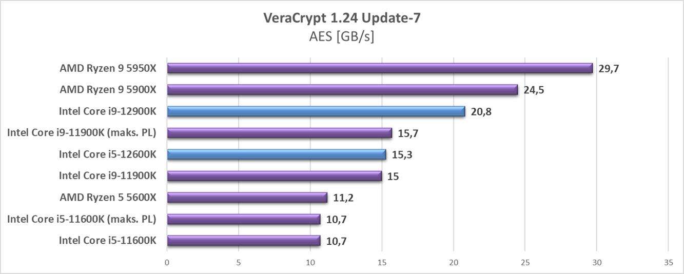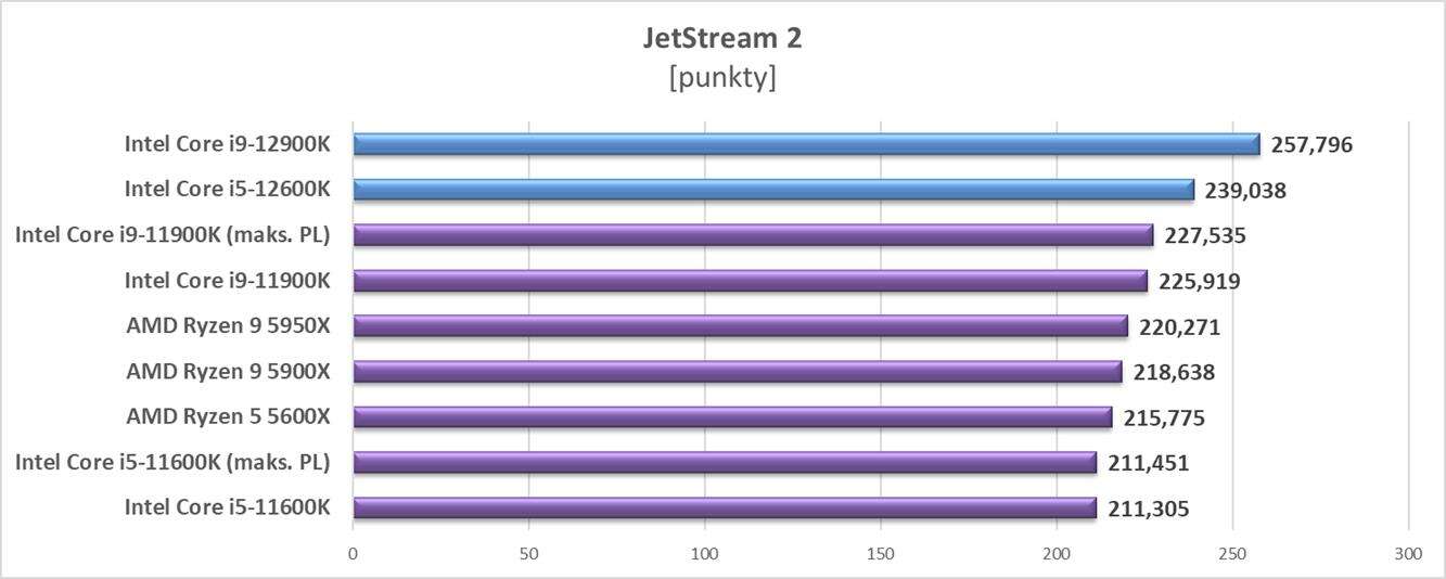 Procesory Intel 11. generacji przetestowałem przy dwóch ustawieniach. Domyślne to włączone stany PL1 i PL2, które mają różną moc. Tutaj jest to domyślne ich działanie, ale odblokowanie limitów mocy może znacznie wpłynąć na niektóre wyniki, plus na większości płyt głównych domyślne ustawienia są inne, dlatego też dodatkowo przetestowałem je po zdjęciu limitów mocy. W przypadku procesorów Intel 12. generacji przetestowałem je przy ustawieniu PL1=PL2=MTP, które rekomenduje Intel i które wreszcie wydają się sensownym ustawieniami. Jeśli chcielibyście je zobaczyć w dodatkowych ustawieniach np. po włączeniu PL1 na 125 W i tau 56 s, albo po całkowitym zdjęciu limitów mocy, to dajcie znać. W obu przypadkach technologie typu MCE zostały wyłączone. W przypadku procesorów AMD przetestowałem je przy domyślnych ustawieniach, przy wyłączonej opcji PBO.