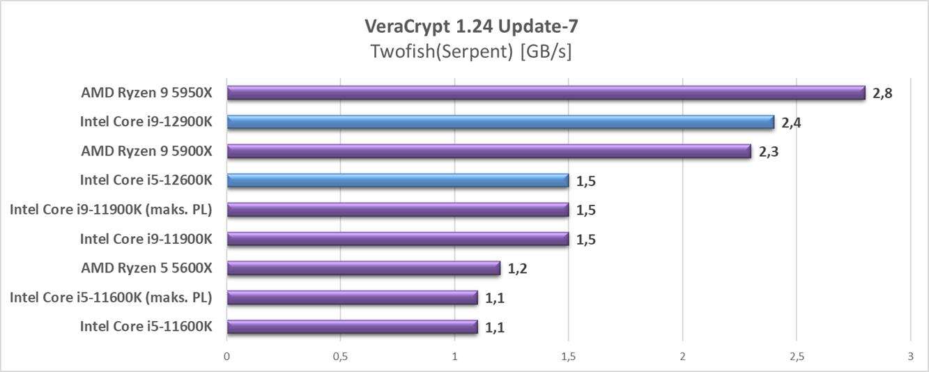 VeraCrypt oparty jest o znane oprogramowanie TruCrypt. Pozwala ono na proste szyfrowanie dysków i jest open-source, stąd z oprogramowania korzysta sporo osób. VeraCrypt ma wbudowany test sprawdzający wydajność różnych algorytmów. Na wykresach poniżej znajdziecie średnie wyniki trzech testów: AES, Twofish(Serpent) oraz Kuznyechik(Serpent(Camellia)).