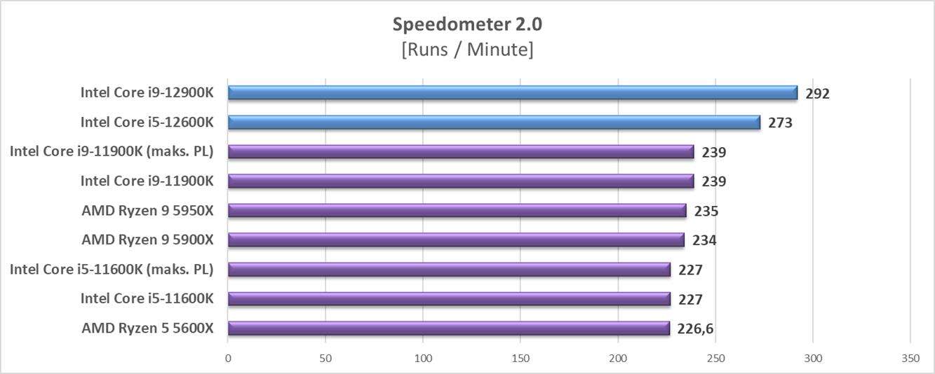 Speedometer 2.0 to test mierzący responsywność aplikacji internetowych. Symuluje on działania użytkownika, przez co dobrze może pokazywać, jak w tym temacie wypadają różne procesory. Test przeprowadziłem przy wykorzystaniu przeglądarki Google Chrome.