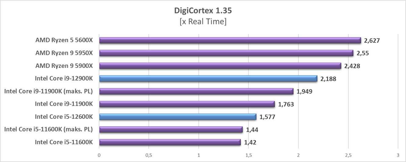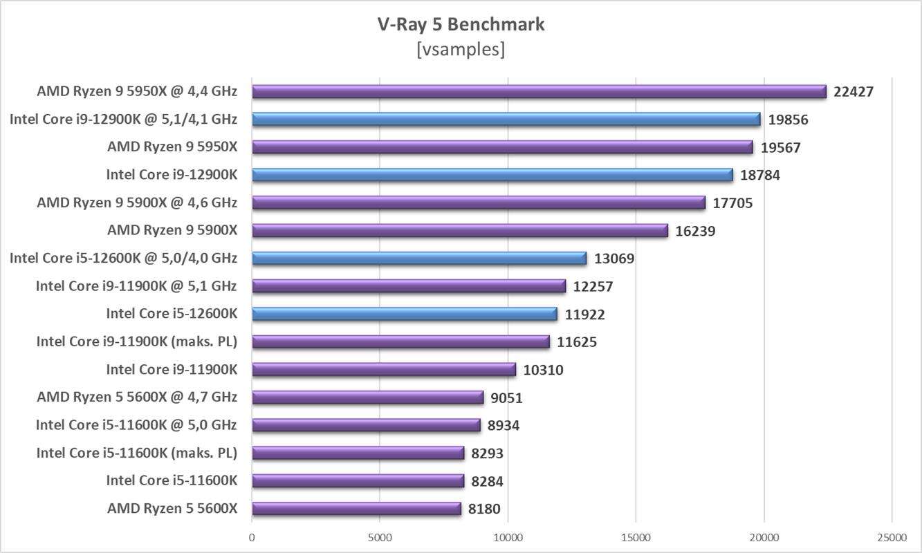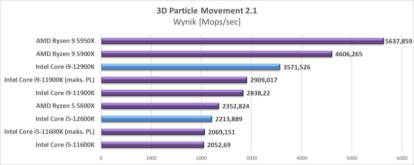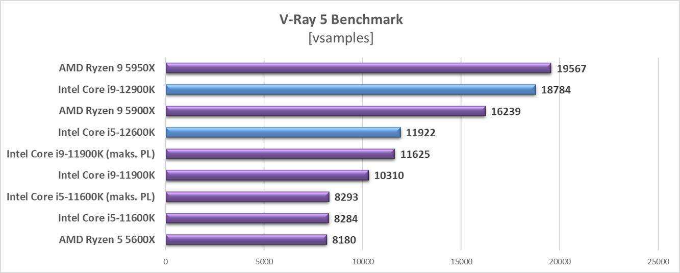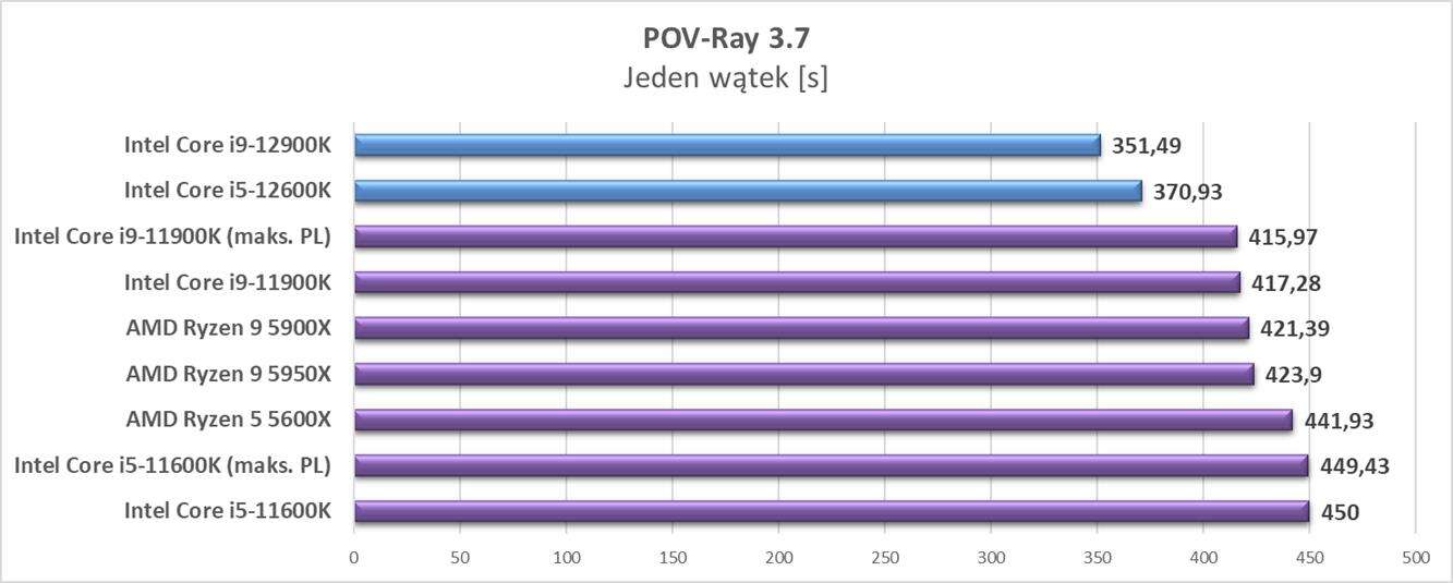 Intel Core i9-12900K to konstrukcja wydajniejsza od Ryzena 9 5900X i minimalnie słabsza od Ryzena 9 5950X. W testach jednowątkowych jest to najwydajniejszy procesor w zestawieniu, czego przykładem jest Cinebench R23 czy POV-RAY. W wielowątkowych udaje mu się wygrywać nawet z Ryzenem 9 5950X (Cinebench R23, 3DMark CPU Profile). Jednakże mniejsza ilość wątków daje o sobie znać, więc w programach takich jak CPU-Z czy V-Ray rezultaty są minimalnie słabsze. Jest to więc świetny wynik pokazujący, że Intel odrobił swoją pracę .