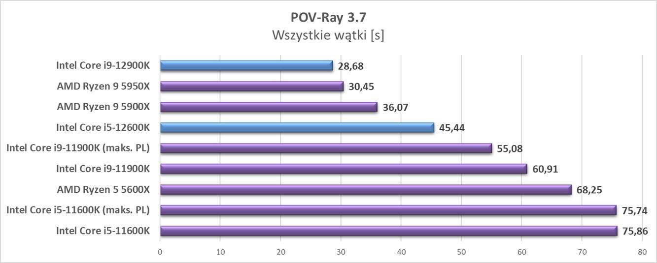 POV-Ray to program pozwalający na tworzenie obrazów z wykorzystaniem ray tracingu. Jego głównym zastosowaniem jest tworzenie grafiki 3D. W testach wykorzystałem wbudowany benchmark sprawdzający wydajność jedno i wielowątkową.