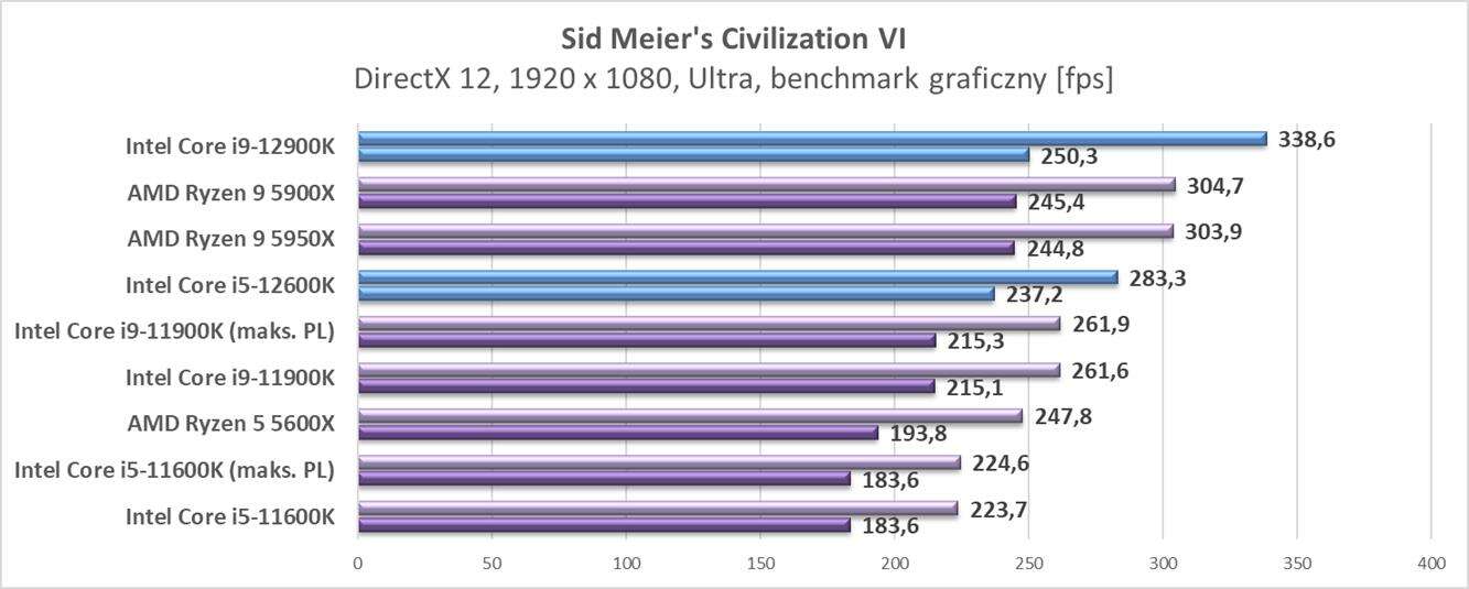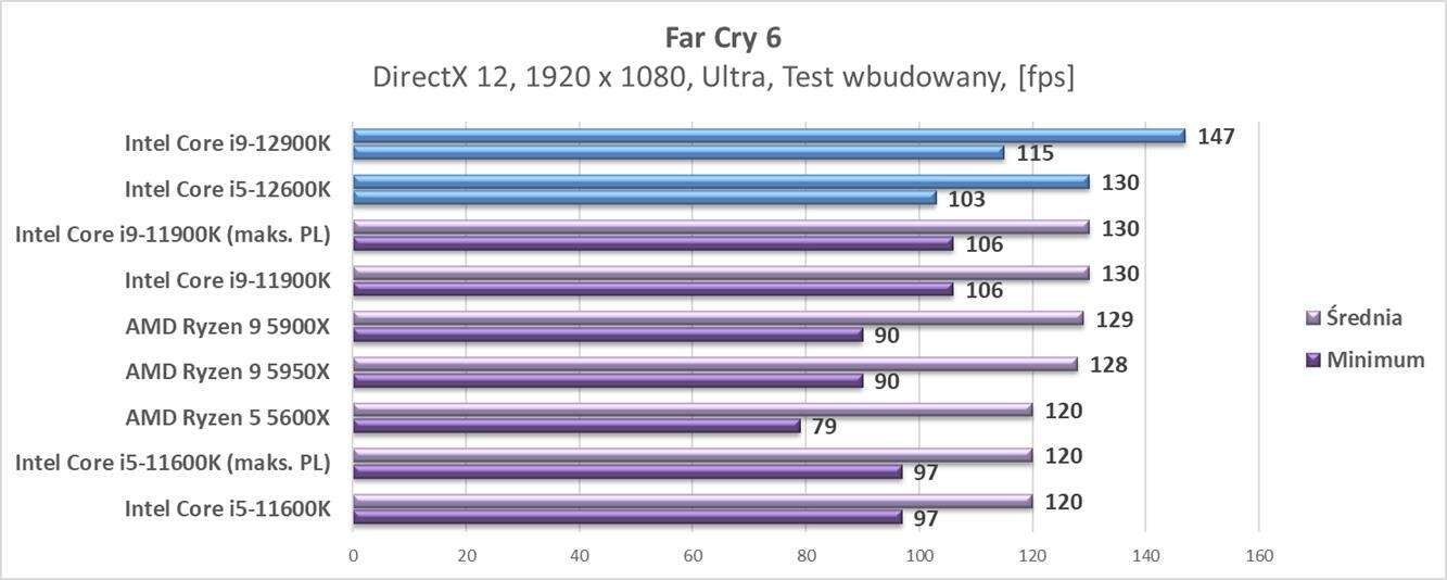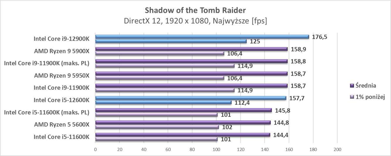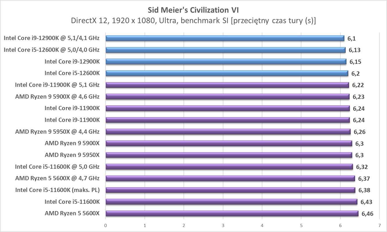 W grach ponownie widać znaczący wzrost wydajności. Intel Core i5-12600K wypada średnio na poziomie i9-11900K czy Ryzenów 9, co jest fantastycznym rezultatem. Wyniki są też znacznie wyższe od 6-rdzeniowych poprzedników. Intel Core i9-12900K jest z kolei zdecydowanym liderem rankingu. Procesor zapewnia więc najwyższą wydajność w każdym z testowanych tytułów i tutaj nie ma wątpliwości co wybrać do grania. Warto tutaj wspomnieć o problemach z DRM w grach, ale Intel obiecał, że zostaną one naprawione nawet w starszych tytułach.