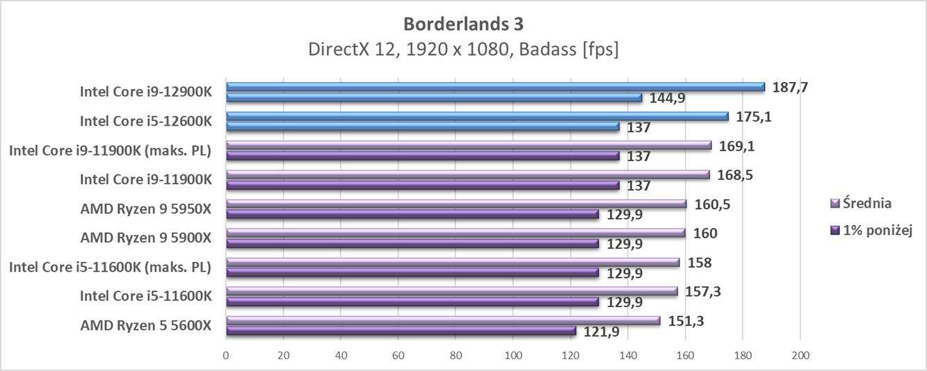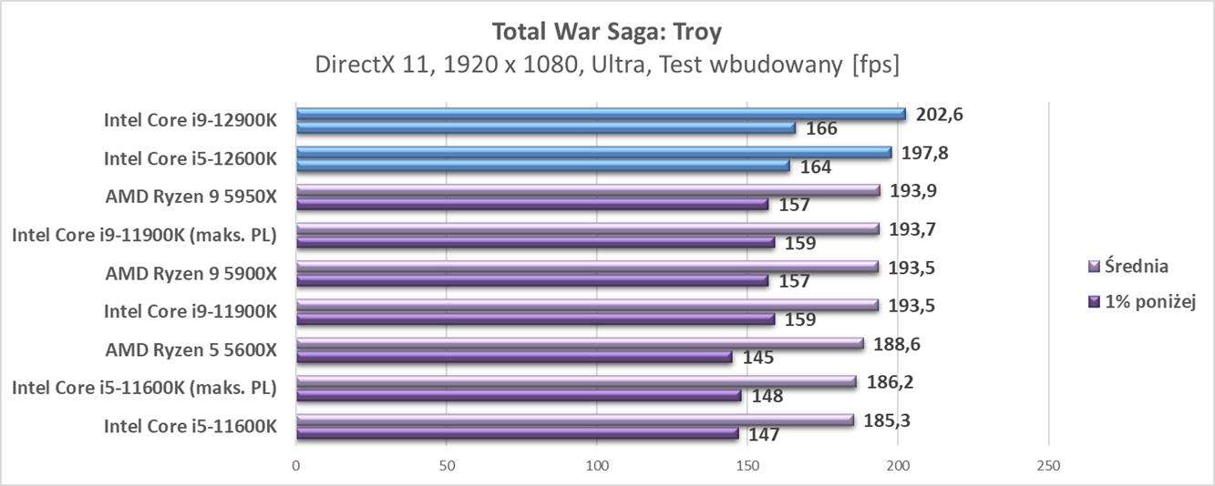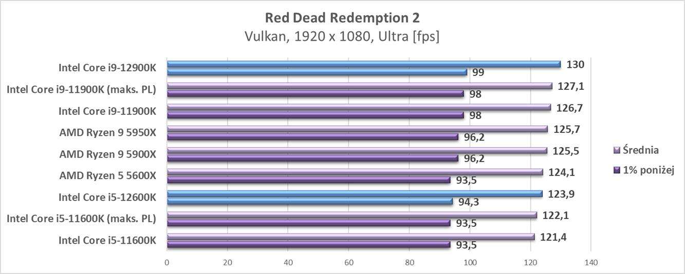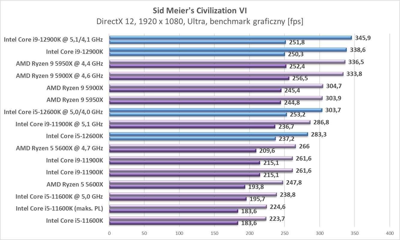 W grach ponownie widać znaczący wzrost wydajności. Intel Core i5-12600K wypada średnio na poziomie i9-11900K czy Ryzenów 9, co jest fantastycznym rezultatem. Wyniki są też znacznie wyższe od 6-rdzeniowych poprzedników. Intel Core i9-12900K jest z kolei zdecydowanym liderem rankingu. Procesor zapewnia więc najwyższą wydajność w każdym z testowanych tytułów i tutaj nie ma wątpliwości co wybrać do grania. Warto tutaj wspomnieć o problemach z DRM w grach, ale Intel obiecał, że zostaną one naprawione nawet w starszych tytułach.