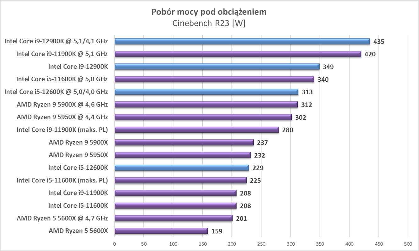 Kolejna rzecz to pobór mocy. Intel Core i5-12600K nie pobiera jej znacznie więcej od poprzedników, a to 12900K wypada już pod tym względem znacznie gorzej i odstaje od niepodkręconych modeli. Wyniki są jeszcze większe po podkręceniu, gdzie potrafią one sięgać ponad 400 W w przypadku 12900K.