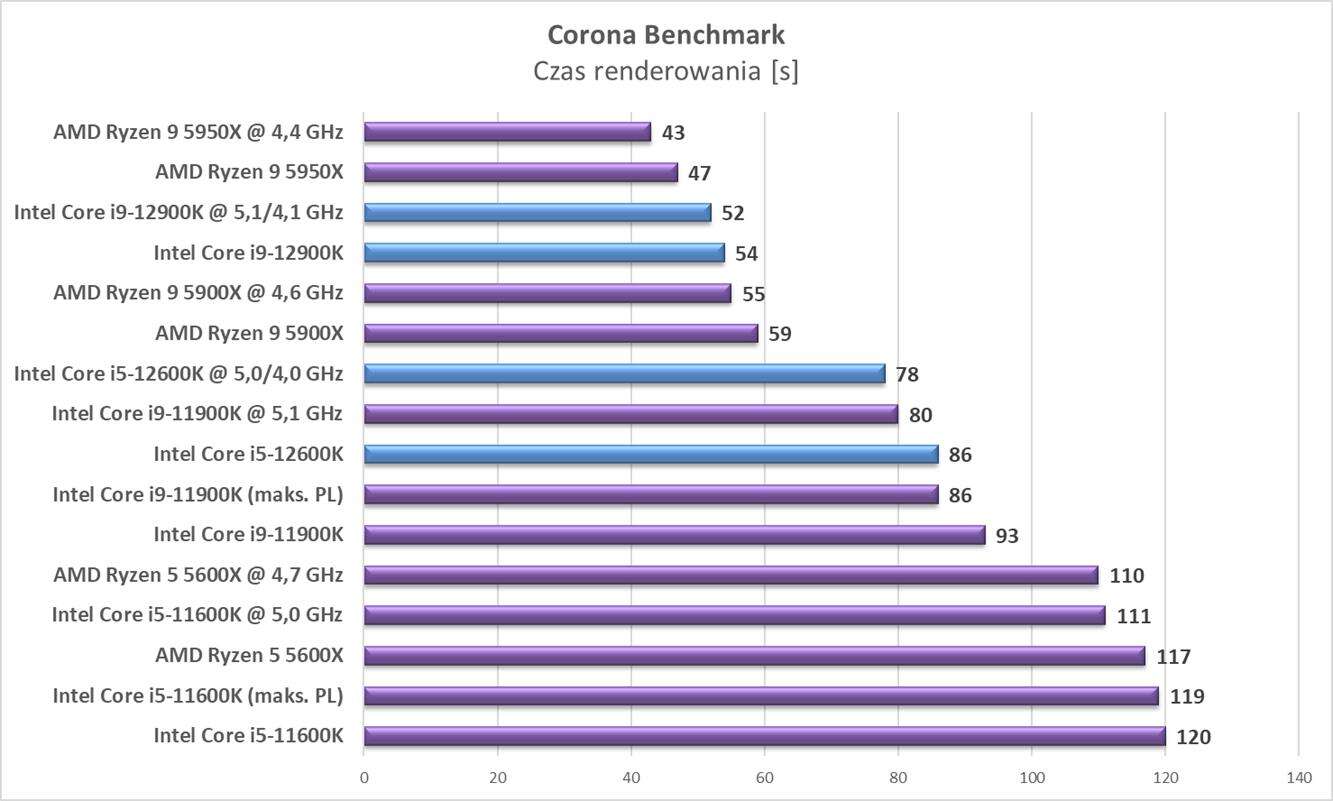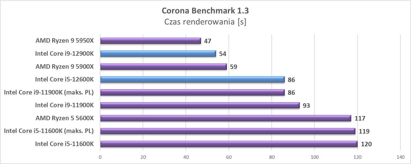Corona to silnik renderujący dostępny dla Autodesk 3ds Max oraz Cinema 4D. Nie obsługuje on renderowania GPU więc tutaj wydajność procesora jest kluczowa. W testach skorzystałem z benchmarku od twórców, który dobrze pokazuje wydajność CPU.