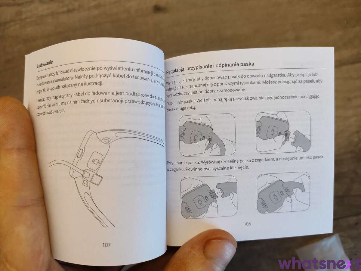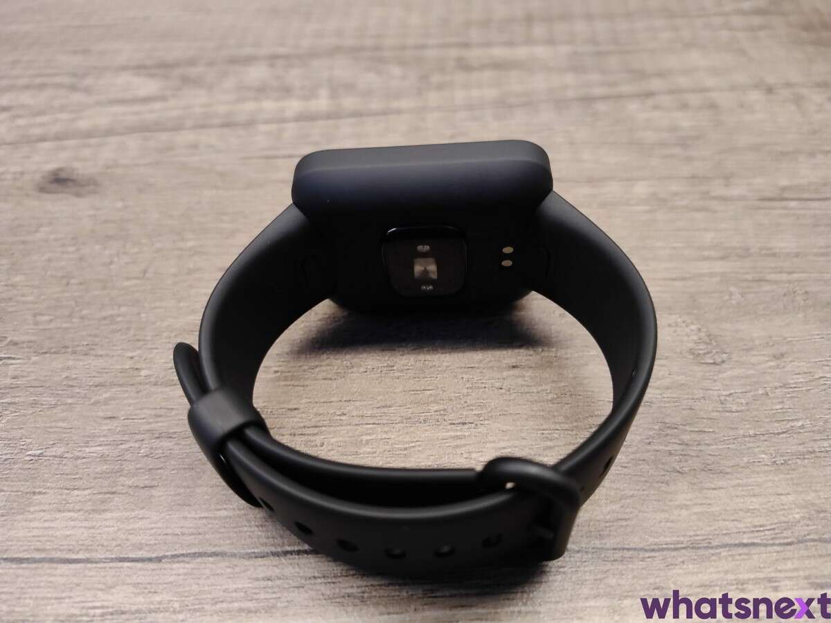 Twardy plastik buduje też główny moduł o stopniu wodoodporności do 5 atmosfer, który posiada trzy najważniejsze elementy. Mowa o plastikowym „tic-tacowym” przycisku na samym środku prawej krawędzi, zestawie czujników na spodzie w towarzystwie pinów do ładowania i wyświetlaczu na wierzchu. Chociaż zastosowane szkło ochronne posiada przyjemnie zaokrąglone krawędzie aż po samą krawędź zewnętrzną, pod nim znajduje się wprawdzie ciągle panel LCD, ale nie lepszej jakości IPS, a TFT. Wprawdzie jest on większy względem poprzedniego modelu (1,55 vs 1,4 cali) i posiada też więcej pikseli (360 x 320 vs 320 x 320), ale jest nieco gorszej jakości przez starszą technologię i mniej wyrazisty przez spadek gęstości pikseli z 323 do 311 pikseli na cal.