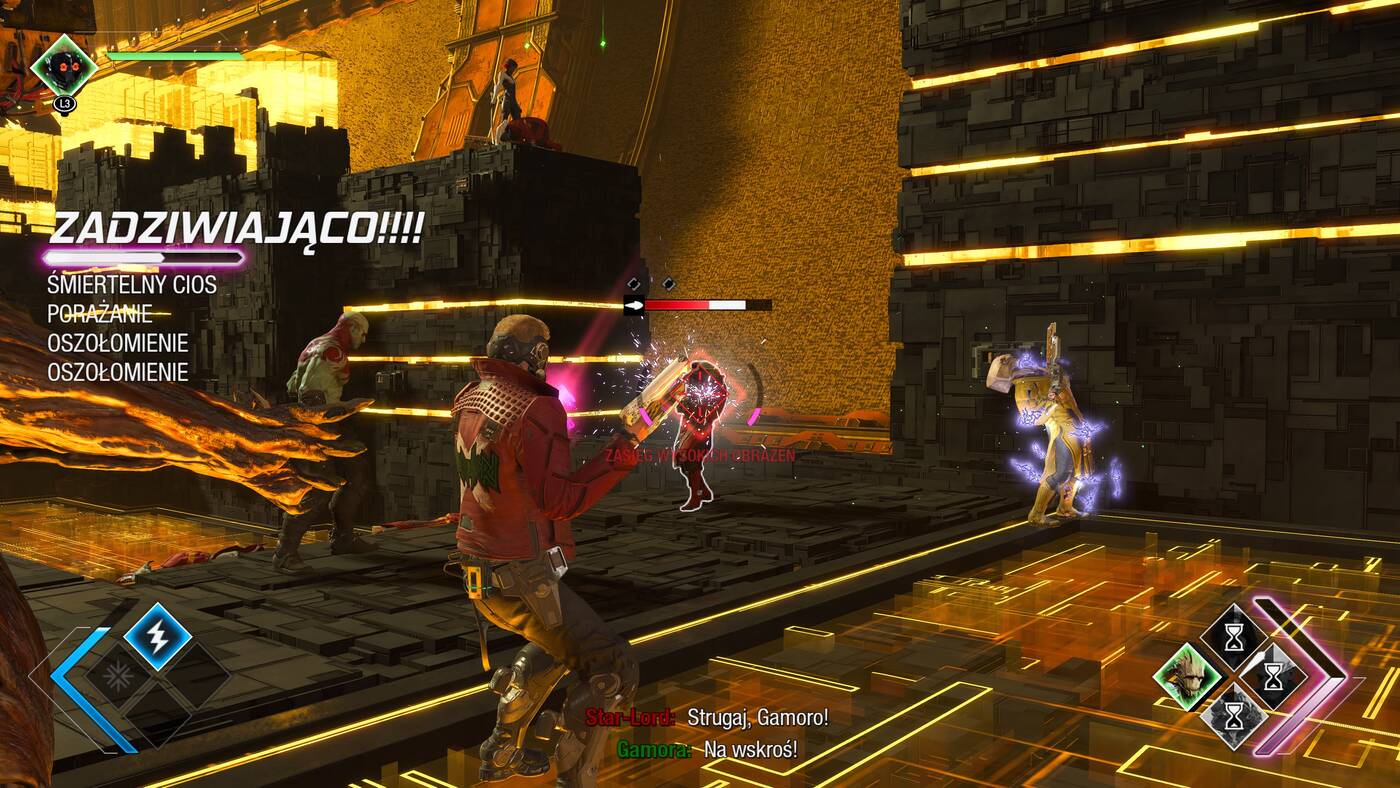 Skoro już o walce mowa. Początkowo byłem zaskoczony tym, że deweloperzy umożliwiają nam tylko rozgrywkę jako Peter Quill. Ostatecznie uznaję jednak, że to nie był taki głupi pomysł. To jaki jest Star-Lord zależy od nas, a nasze wypowiedzi budują relacje z resztą ekipy. W ten sposób lepiej czuć zacieśniająca się znajomość Strażników Galaktyki, a i kilka kwestii fabularnych jest dzięki temu prowadzonych w ciekawszy sposób, niż w przypadku gdybyśmy każdego dobrze znali.