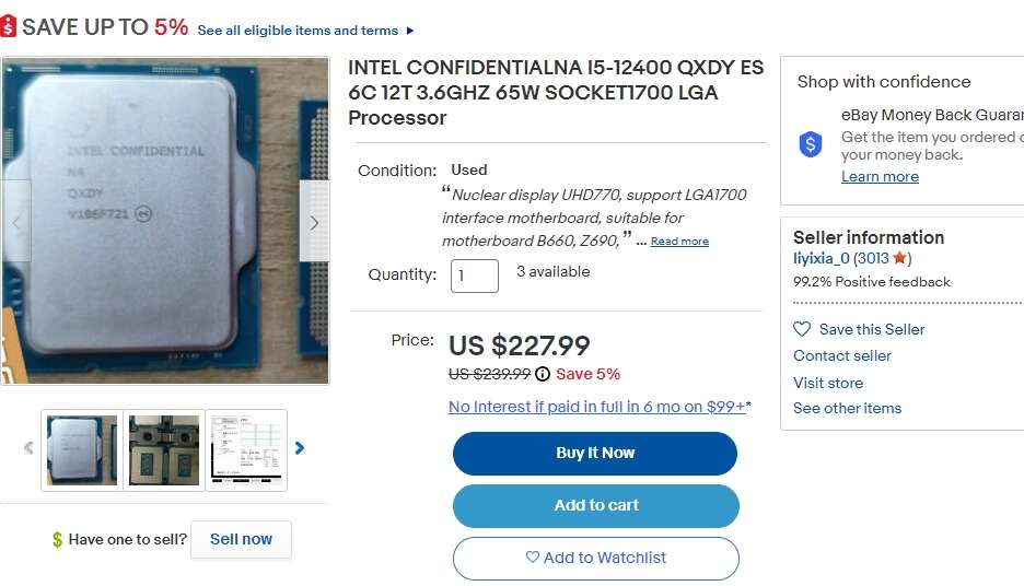 Powyżej możecie rzucić okiem na przykład sprzedaży jednej z takich próbek Intel Core i5-12400 oznaczonej kodem QXDY za 227,99$ z wersją rdzenia krzemowego C0. Jego sześć rdzeni jest taktowanych zegarem 4 GHz, a obok nich zamiast iGPU UHD730, znalazł się rdzeń graficzny HD 770 rodem z Core i5-12600.