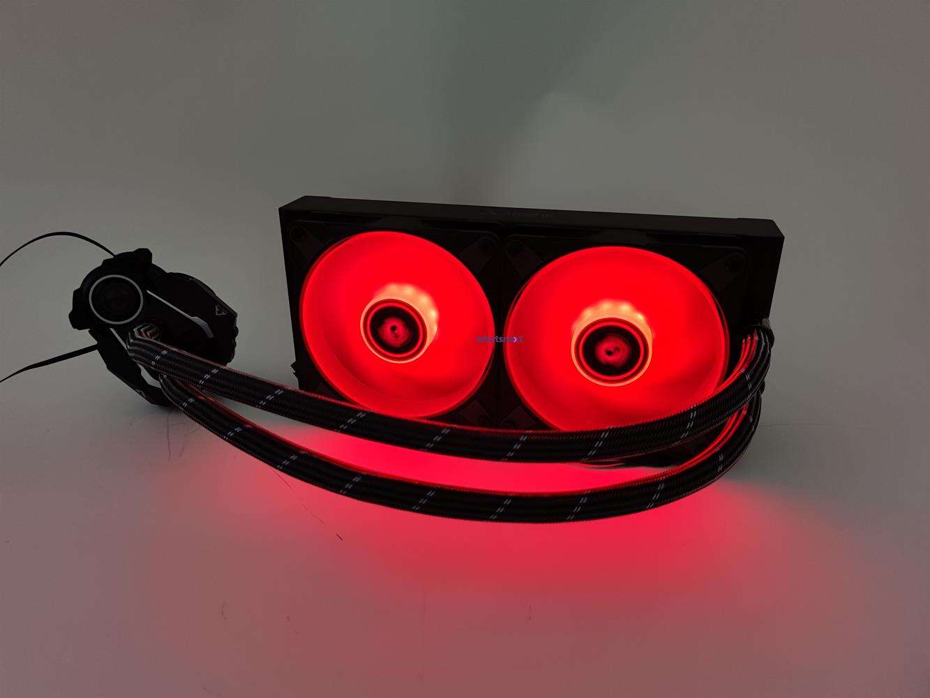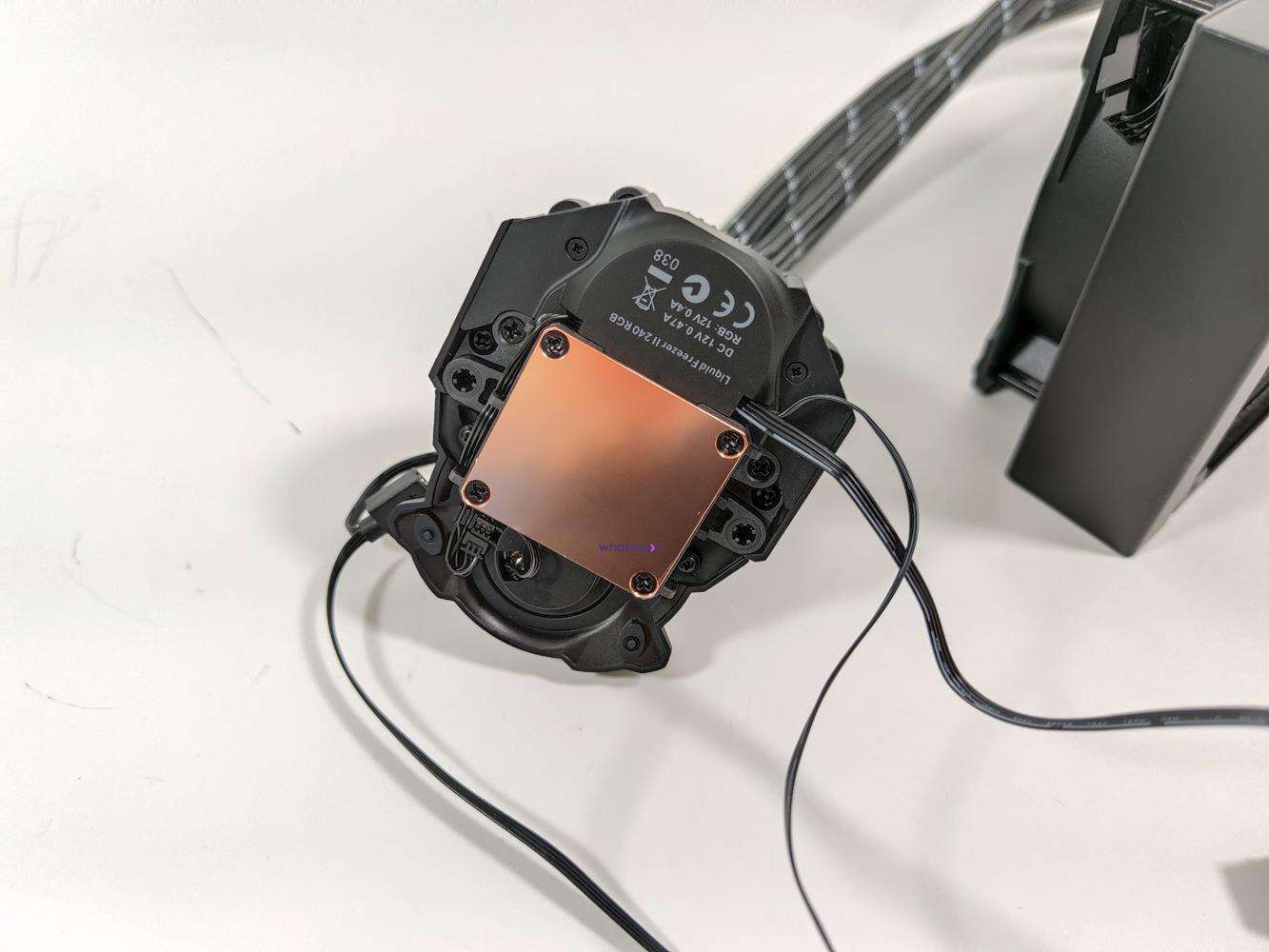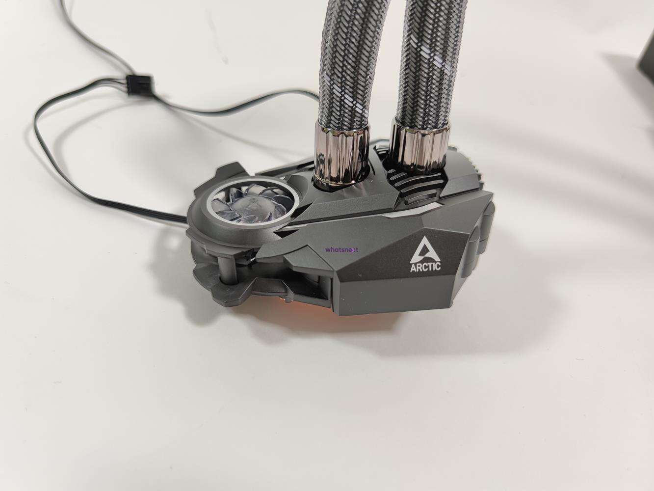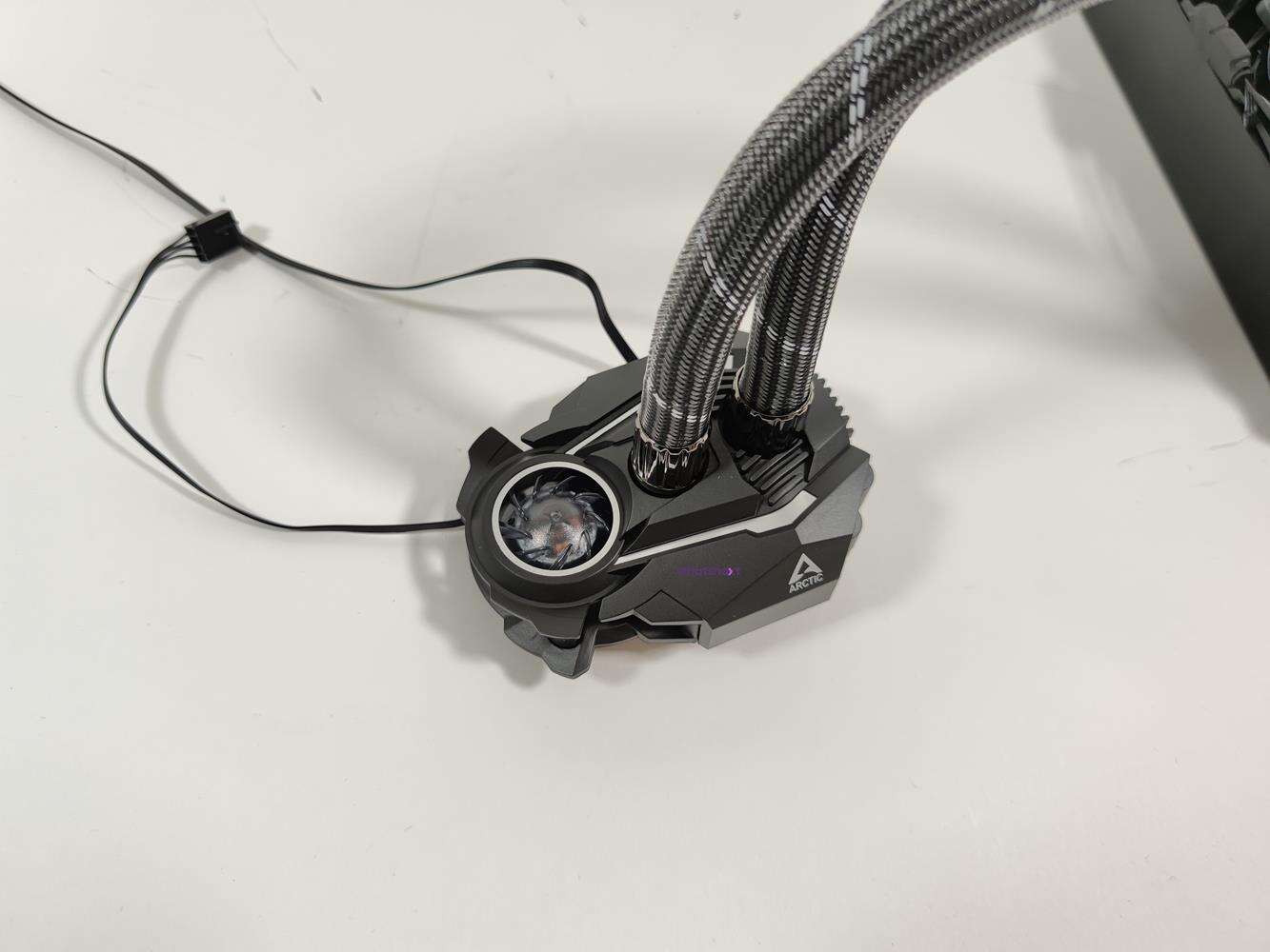 Z chłodnicy wychodzą dwa węże o długości 450 mm i zewnętrznej średnicy równej 12,4 mm. Są one dosyć elastyczne i łączą się z blokopompką od góry. Dzięki temu nie powinno być żadnych problemów z ich ułożeniem w obudowie. Sama blokopompka ma miedzianą podstawkę. Znajduję się tutaj takżę 40 mm wentylator, którego celem jest schłodzenie sekcji zasilania płyty. Jego maksymalne obroty to 3000 RPM. Sama pompka pracuje z prędkością do 2000 RPM. Z blokopompki wychodzą dwa kable – 4 pin PWM oraz 4 pin RGB (męski + żeński). Co ciekawe całość podłączamy tylko tymi złączami do płyty głównej – wentylatory również są pod to podłączone i wszystko jest ze sobą zsynchronizowane.