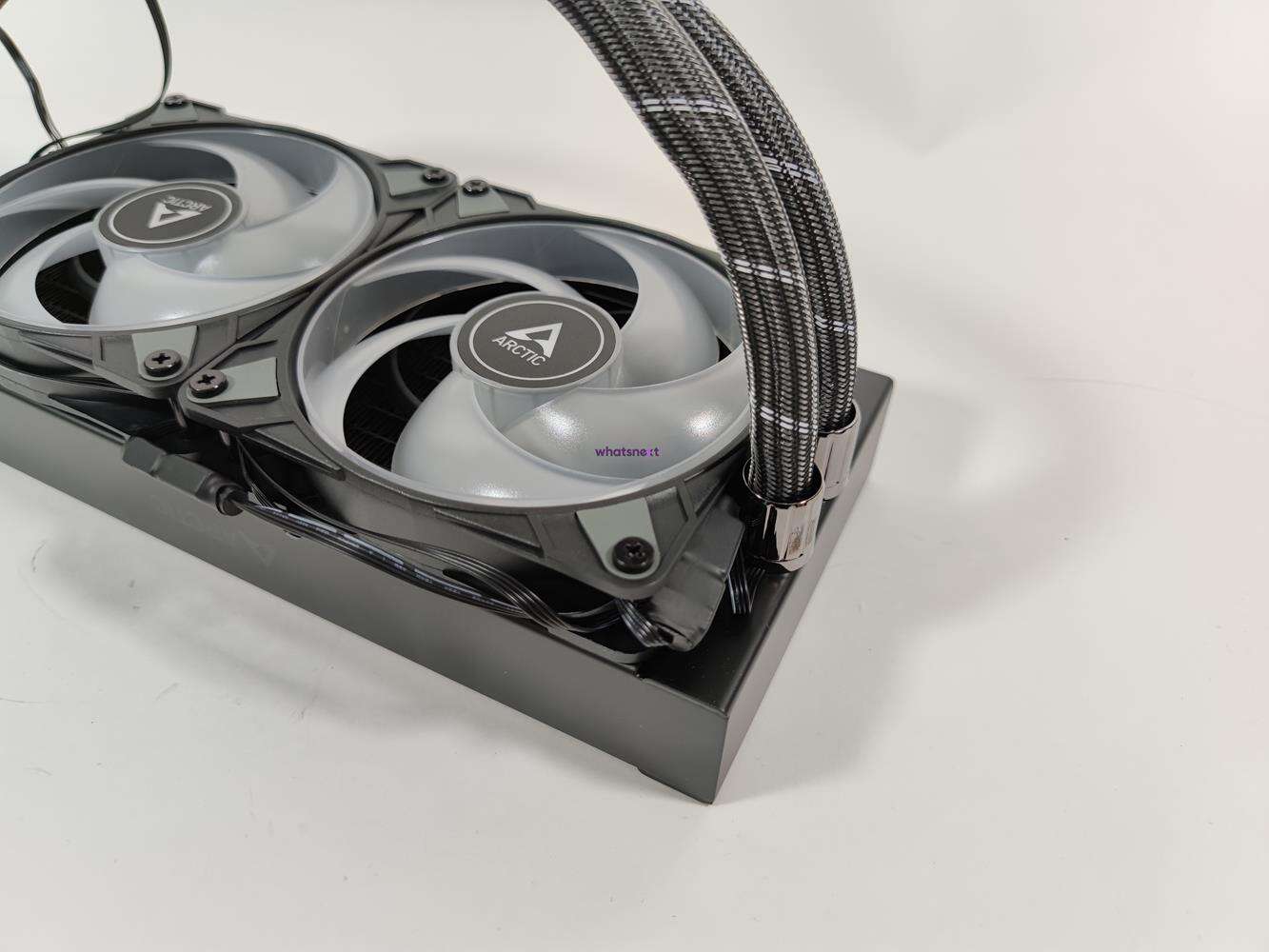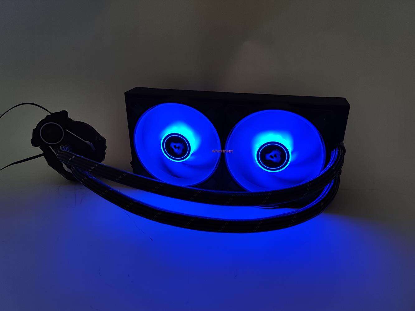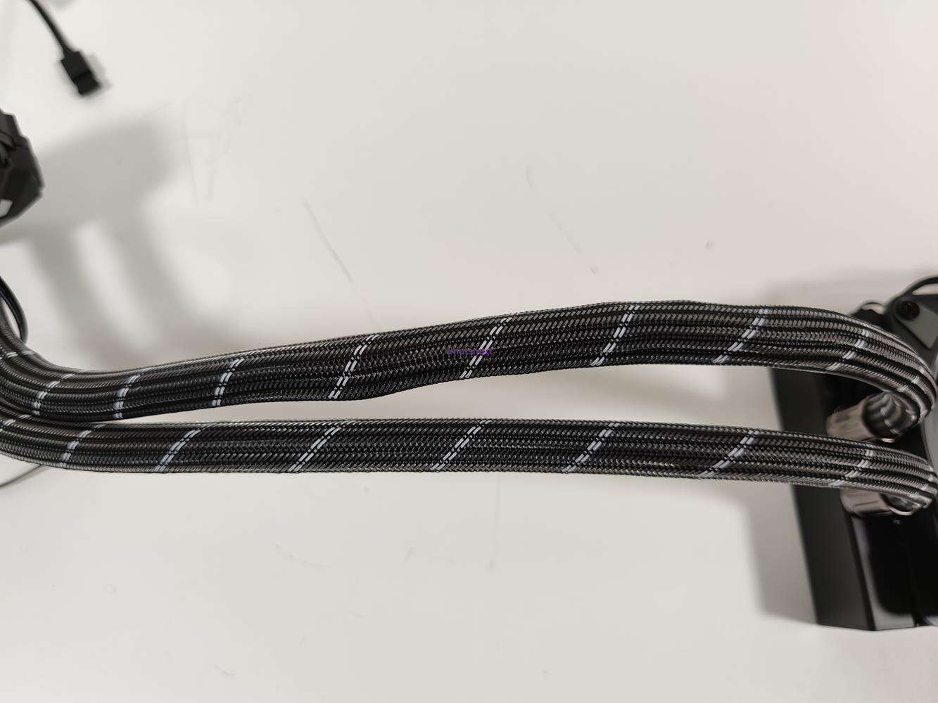 Z chłodnicy wychodzą dwa węże o długości 450 mm i zewnętrznej średnicy równej 12,4 mm. Są one dosyć elastyczne i łączą się z blokopompką od góry. Dzięki temu nie powinno być żadnych problemów z ich ułożeniem w obudowie. Sama blokopompka ma miedzianą podstawkę. Znajduję się tutaj takżę 40 mm wentylator, którego celem jest schłodzenie sekcji zasilania płyty. Jego maksymalne obroty to 3000 RPM. Sama pompka pracuje z prędkością do 2000 RPM. Z blokopompki wychodzą dwa kable – 4 pin PWM oraz 4 pin RGB (męski + żeński). Co ciekawe całość podłączamy tylko tymi złączami do płyty głównej – wentylatory również są pod to podłączone i wszystko jest ze sobą zsynchronizowane.