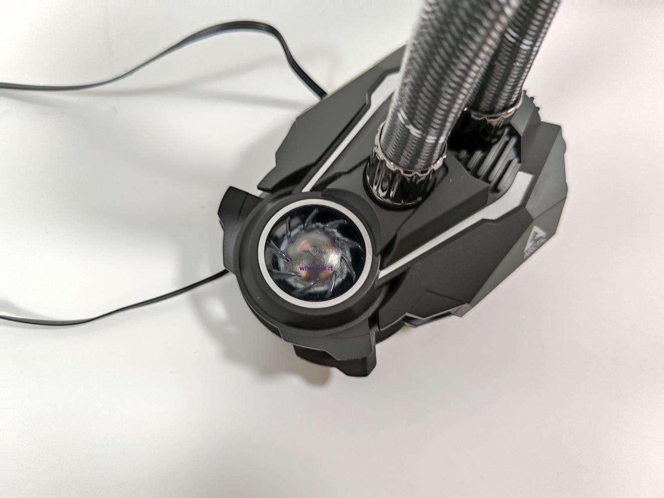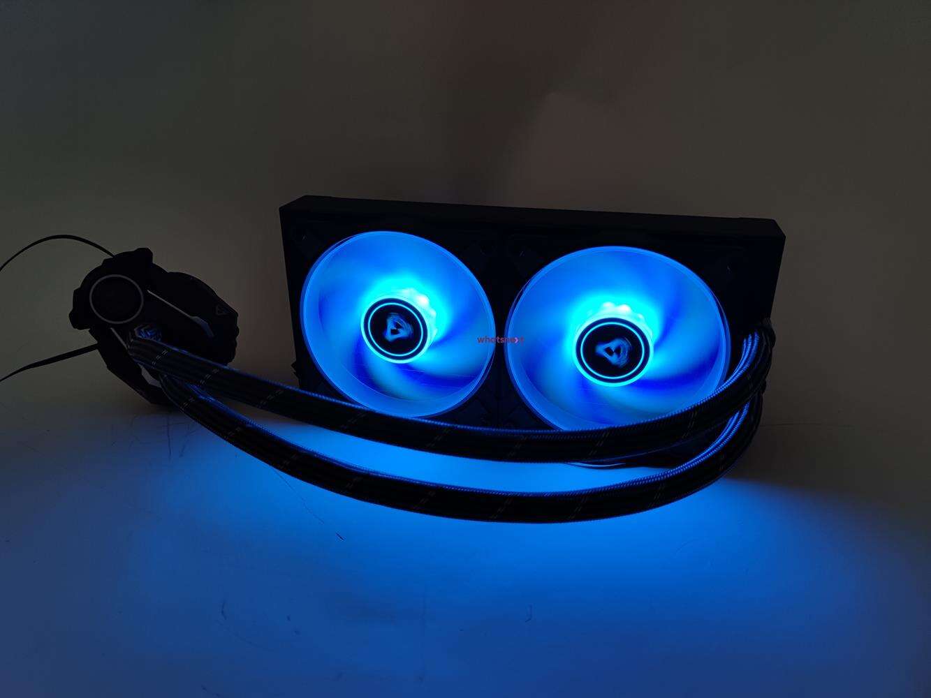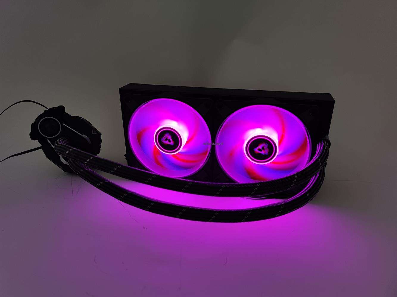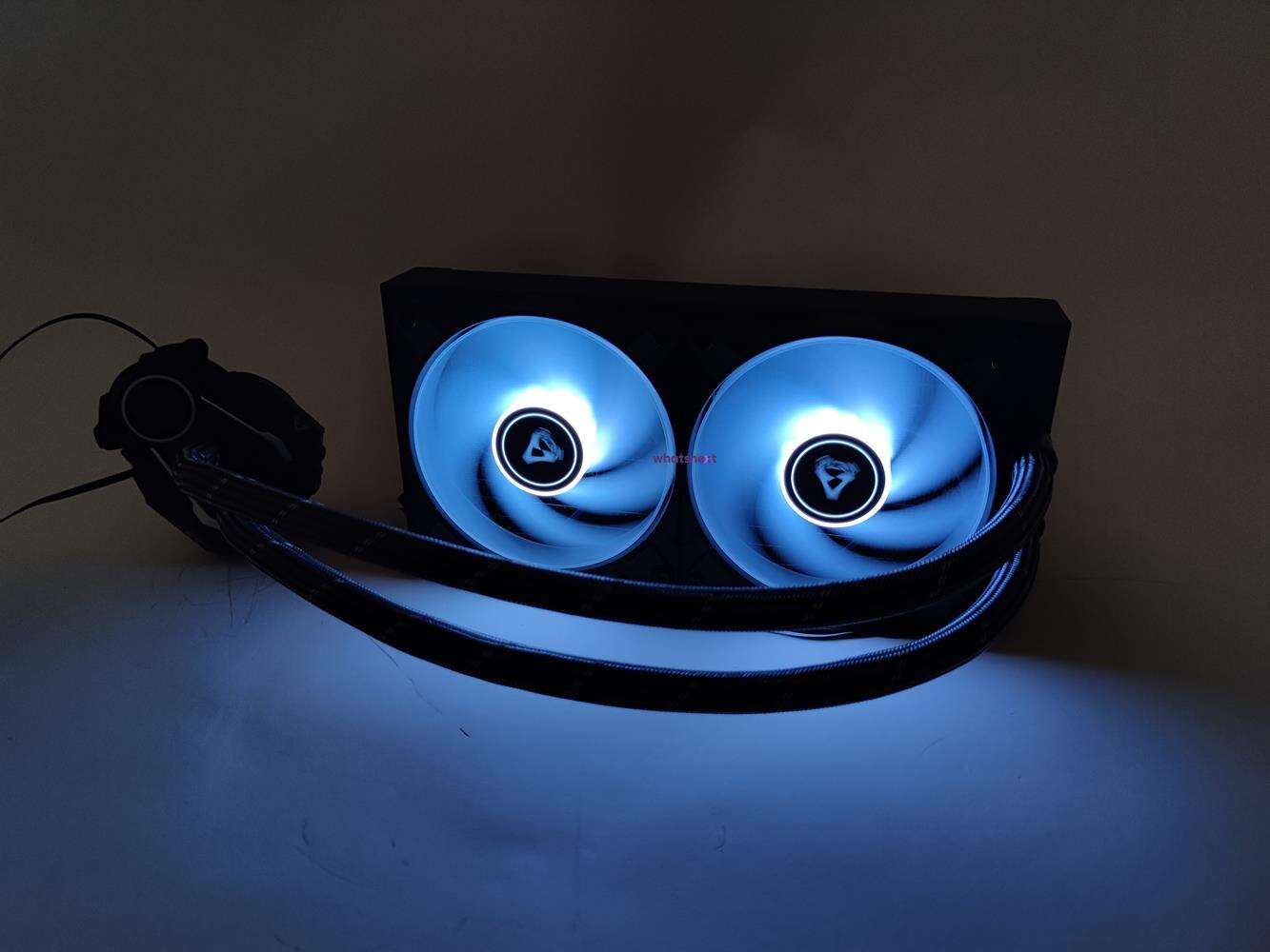 Z chłodnicy wychodzą dwa węże o długości 450 mm i zewnętrznej średnicy równej 12,4 mm. Są one dosyć elastyczne i łączą się z blokopompką od góry. Dzięki temu nie powinno być żadnych problemów z ich ułożeniem w obudowie. Sama blokopompka ma miedzianą podstawkę. Znajduję się tutaj takżę 40 mm wentylator, którego celem jest schłodzenie sekcji zasilania płyty. Jego maksymalne obroty to 3000 RPM. Sama pompka pracuje z prędkością do 2000 RPM. Z blokopompki wychodzą dwa kable – 4 pin PWM oraz 4 pin RGB (męski + żeński). Co ciekawe całość podłączamy tylko tymi złączami do płyty głównej – wentylatory również są pod to podłączone i wszystko jest ze sobą zsynchronizowane.