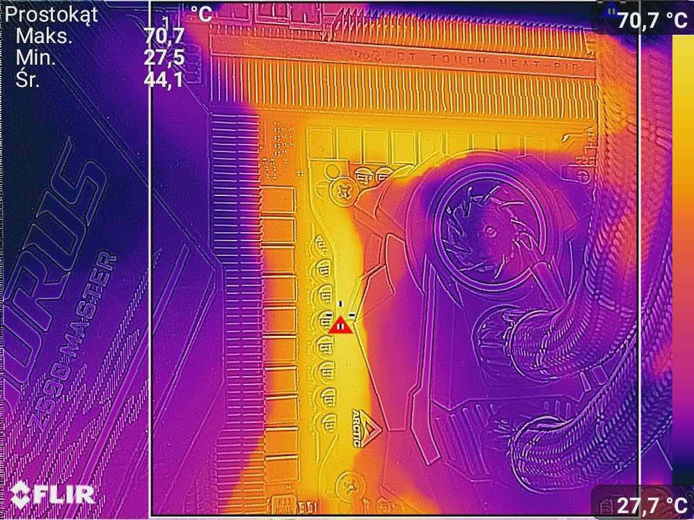 Temperatury zanotowane przez czujnik na płycie to kolejno (wentylator wyłączony i włączony) 64°C i 57°C. Wentylator obniża więc temperatury sekcji zasilania, natomiast nie są to wybitnie wielkie różnice. Jednakże te kilka stopni może mieć znacznie np. przy obudowach z naprawdę słabym przepływem powietrza.