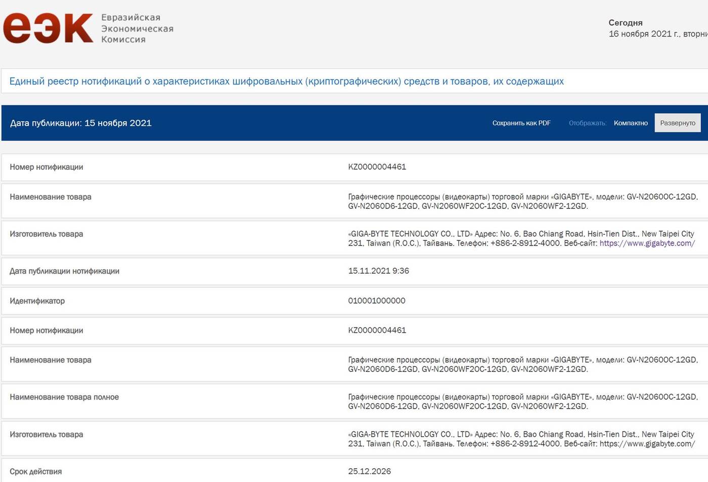 Dziś z bazy danych Eurazjatyckiej Komisji Gospodarczej wyciekły cztery modele tej karty w wykonaniu Gigabyte, potwierdzając jej istnienie. Mowa dokładnie o: