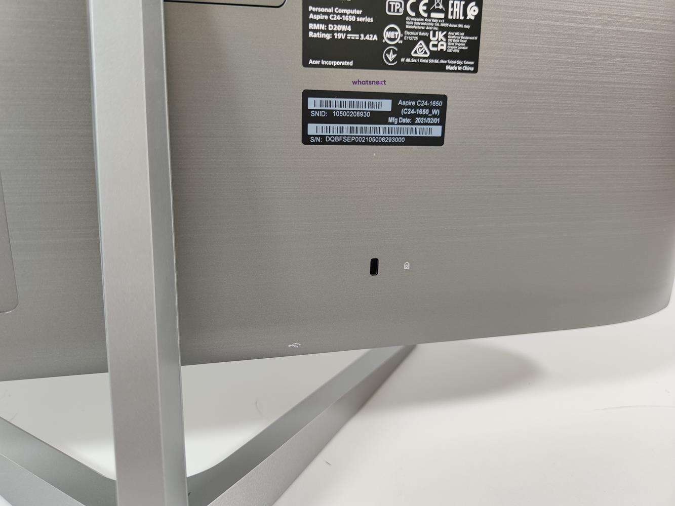 Przejdźmy może do złączy. Obok przycisku włączającego jest USB 2.0 oraz czytnik kart SD. Szkoda, że tutaj właśnie nie ma USB w nowszej odsłonie. Z tyłu mamy do dyspozycji HDMI, ethernet 1 GbE, wejście na zasilacz, 2x USB 3.2 Gen2, 1x USB 3.2 Gen1 oraz złącze audio. Trochę mało jest złączy USB, co będzie przeszkadzało w szczególności, jeśli korzystacie z myszki i klawiatury na to właśnie złącze. Wtedy też tylko dwa pozostaną wolne. Acer Aspire C24-1650 ma też miejsce na blokadę Kensington Lock, co może się przydać w bardziej publicznych miejscach.