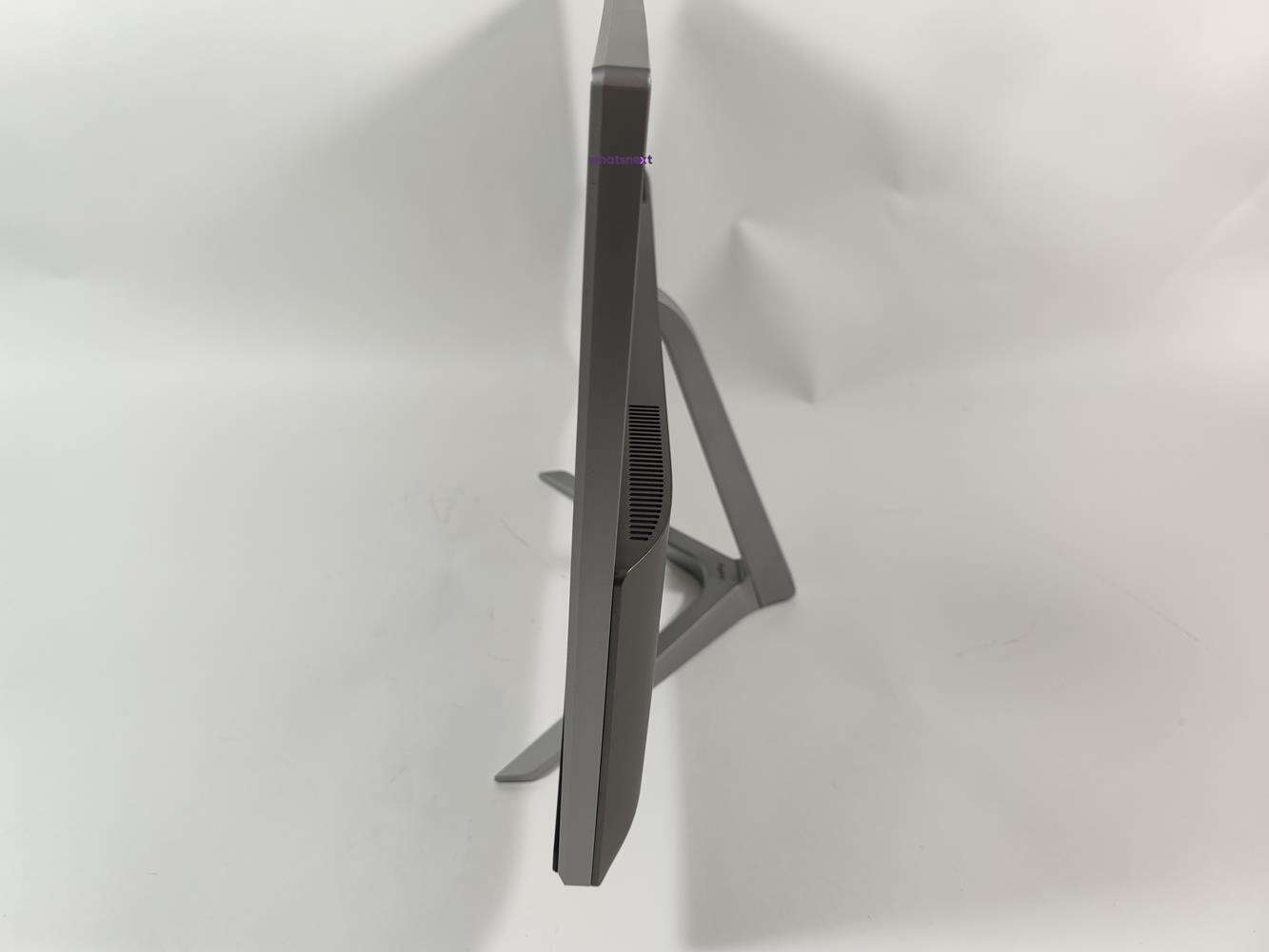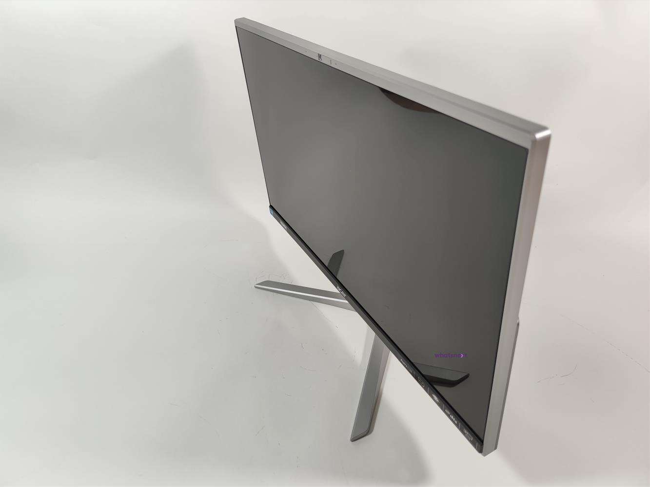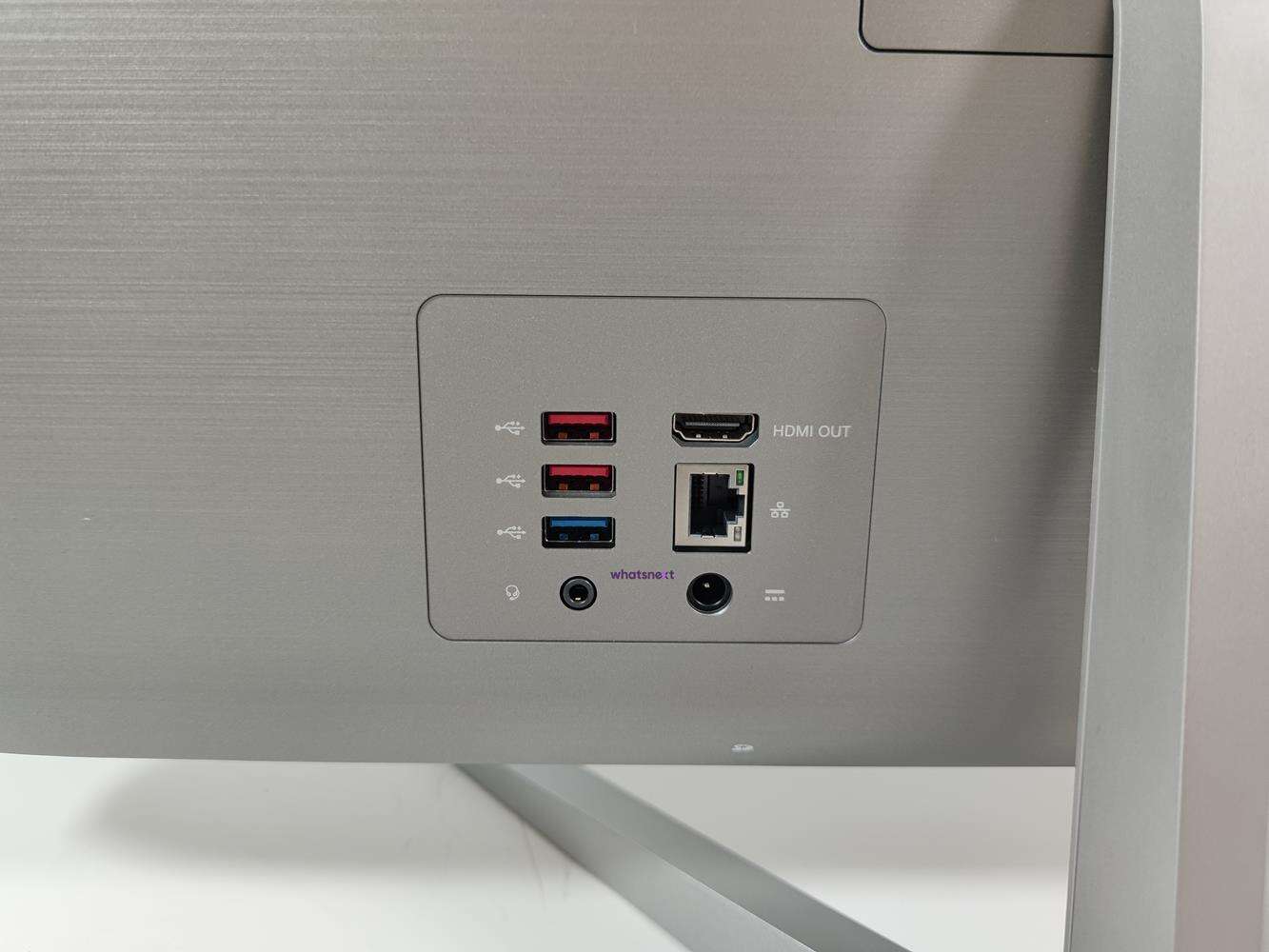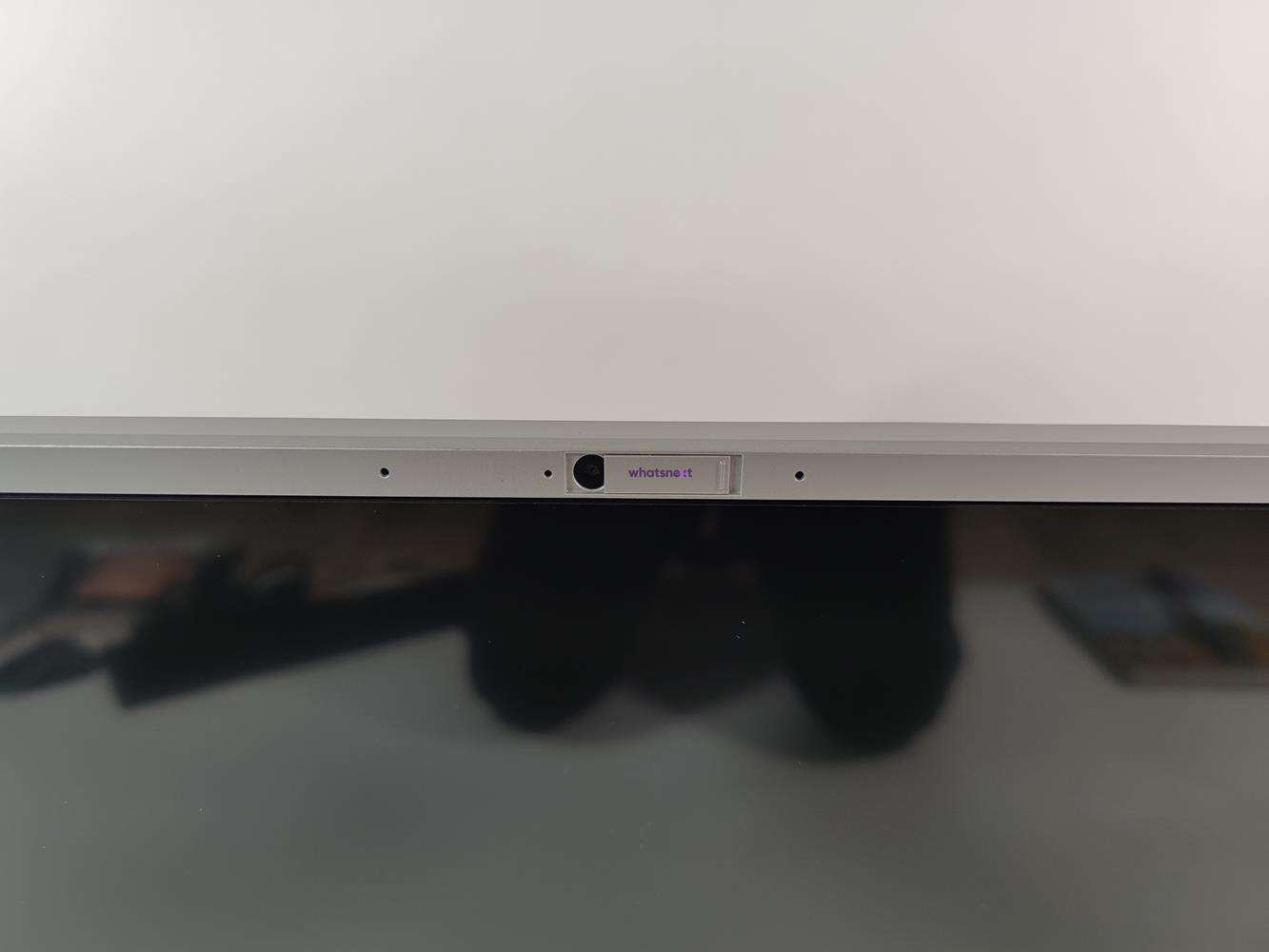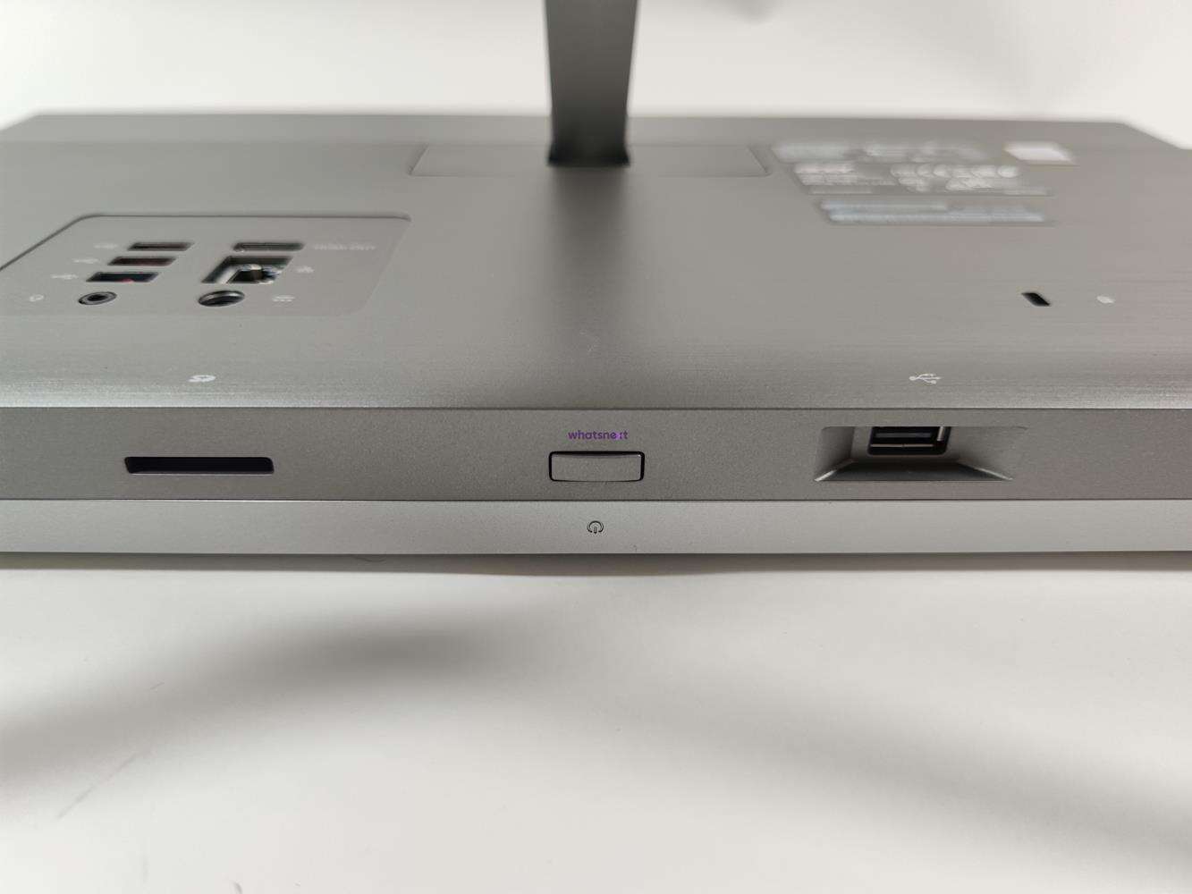 Nad monitorem znajdują się mikrofony oraz kamera Full HD. Co ciekawe jest tam specjalna zasłonka, więc jeśli zazwyczaj zaklejacie kamery w laptopach tutaj nie musicie tego robić. Przycisk włączający znajduje się na samym spodzie. Tam też po bokach producent umieścił głośniki. Są to jednak dosyć słabe konstrukcje pod względem jakości dźwięku. Do wideokonferencji na pewno się nadadzą, natomiast muzyka brzmi naprawdę słabo, podobnie jest z filmami.