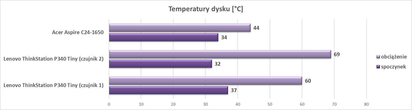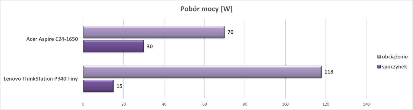 Tutaj testowany sprzęt wypada naprawdę dobrze. W spoczynku pobiera mało mocy, temperatury są niskie, a całość działa naprawdę cicho. Jest zresztą podobnie pod obciążeniem, gdzie nadal jest bardzo cicho, temperatury nie są wybitnie wysokie, a pobór mocy zgodny z oczekiwaniami. Procesor pod obciążeniem pracuje z taktowaniem 2,4 GHz, co jest dosyć niską wartością, ale również bez zaskoczenia.