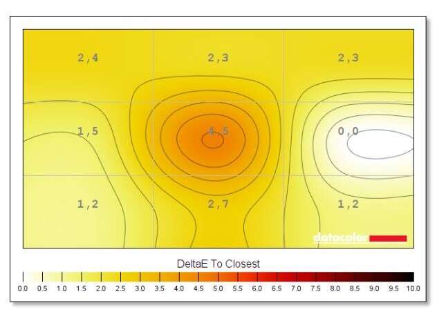 Pokrycie kolorów rzędu 96% sRGB, 76% AdobeRGB, 75% P3 oraz 70% NTSC jest nawet całkiem niezłym wynikiem. Gamma wynosi 2,0, czyli odstaje trochę od idealnej. Maksymalna jasność to 302,9 cd/m^2, kontrast wynosi wtedy 3030:1, natomiast punkt bieli jest fatalny – 11000K to bardzo słaby wynik, bardzo mocno odstający od idealnego. Różnice pomiędzy różnymi częściami ekranu widać też w niejednorodności kolorów czy podświetlenia. Za to odwzorowanie kolorów jest nawet dobre i średnia Delta-E wynosi 1,74. Matryca ma więc swoje wady oraz zalety, natomiast uważam, że do pracy biurowej powinna całkiem nieźle się sprawdzić.