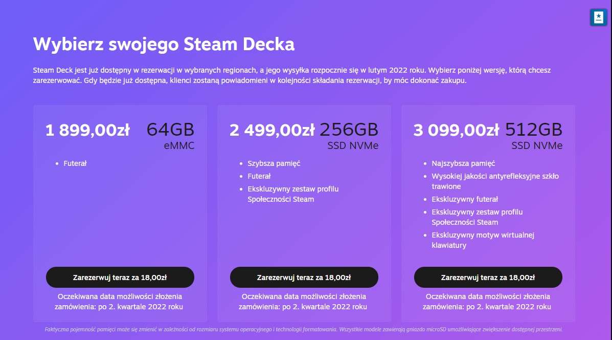 Wiadomości będą trafiać do klientów w dokładnie tej samej kolejności, w której składali rezerwacje, więc nie liczcie, że rezerwując swojego Steam Decka np. dziś, otrzymacie go w pierwszej kolejności. Finalnie rezerwacja za 18 zł będzie odliczona od ceny, która wynosi w Polsce 1899 zł.
