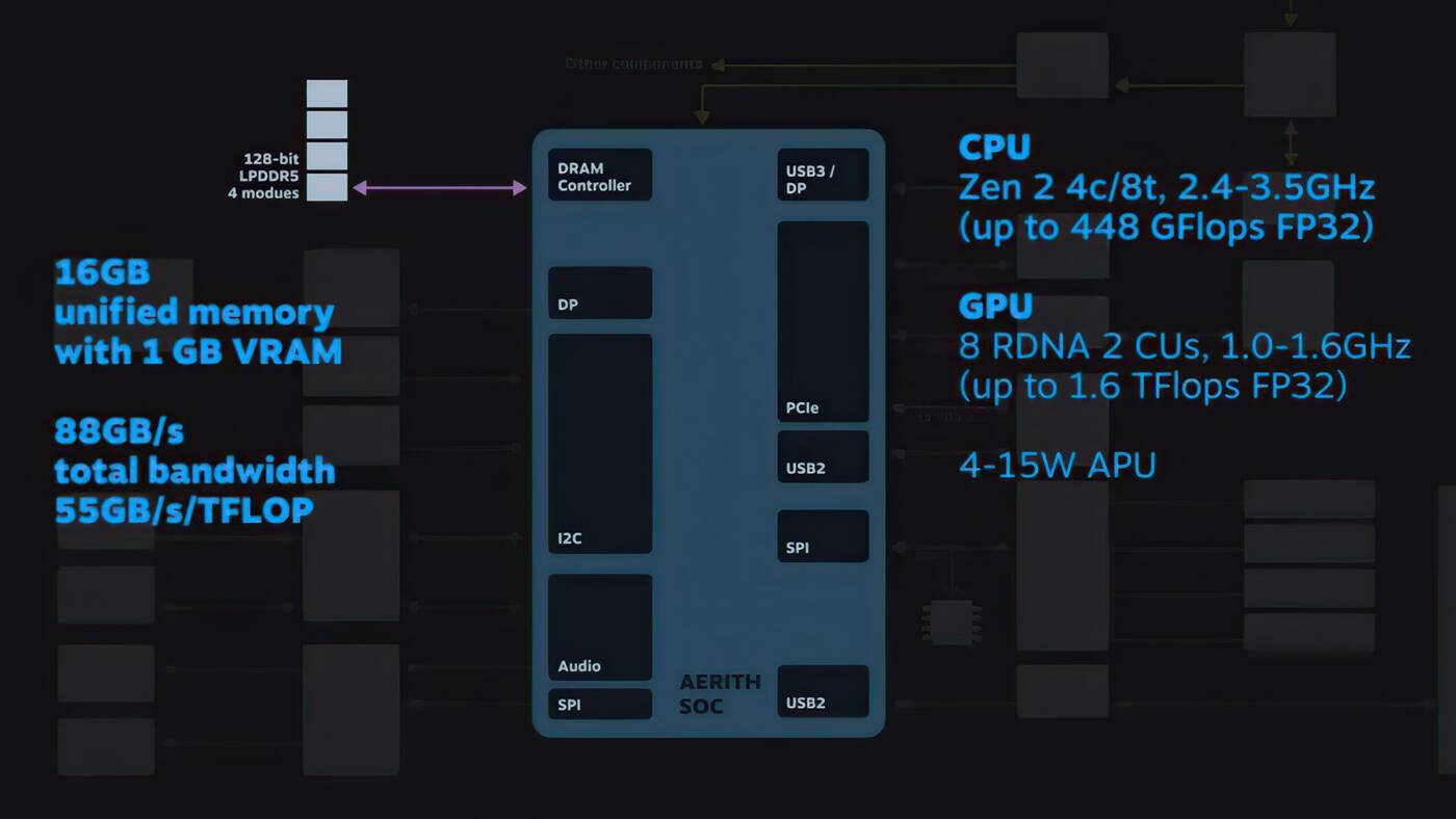 Takie połączenie pożera od 4 do 15 W energii, co plasuje to APU na poziomie energooszczędnych procesorów laptopowych i od razu tłumaczy stosunkowo niskie zegary. Nawet pomimo tego wydajność układu jest przyzwoita, bo osiąga kolejno 448 gigaflopów w przypadku procesora w obliczeniach FP32 oraz 1,6 teraflopa w myśl procesora graficznego przy tego samego rodzaju obliczeniach. To APU łączy się z pamięcią DRAM po 128-bitowej magistrali taktowanej 5,5 GHz, co daje 88 GB/s przepustowości.
