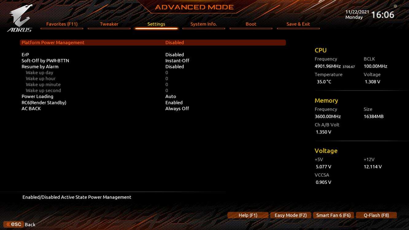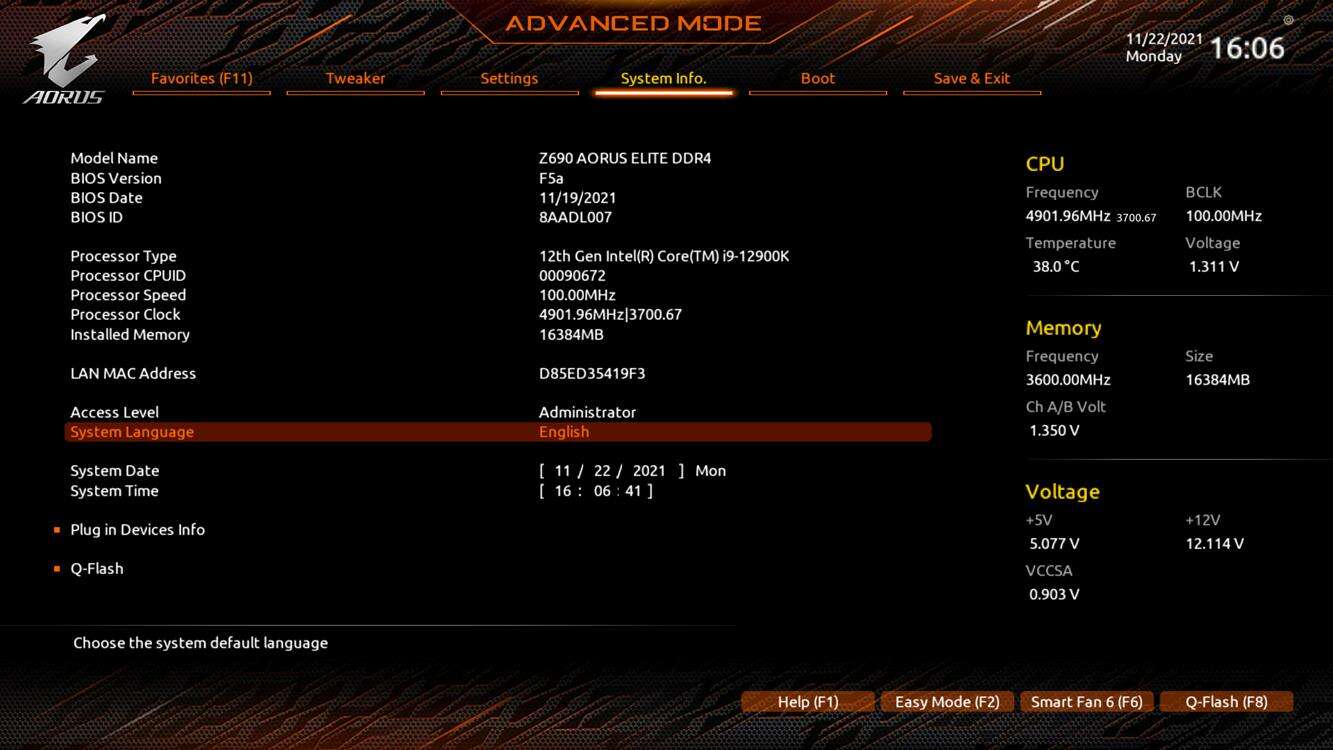 BIOS to największa wada płyty, która praktycznie sprawia, że niestety nie będę mógł Wam jej polecić. Z690 Aorus Elite DDR4 otrzymałem z BIOS w wersji F1, które nadaje się do natychmiastowej aktualizacji. VMD jest domyślnie włączenie, profile XMP praktycznie nie działają stabilnie, a największy problem miałem z 12600K. Procesor ten od obciążeniem miał taktowanie rdzeni E równe 3,7 GHz (Max Boost to 3,6 GHz, All Core Boost 3,4 GHz) co powodowało niestabilne działanie pod obciążeniem. Jest to naprawdę tragedia, ale na szczęście nowy BIOS F5a część z tych rzeczy naprawia. Strona producenta mówi też, że pierwszym wydaniem BIOS jest F3, więc może płyty ze sklepów nie będą miały wersji F1.