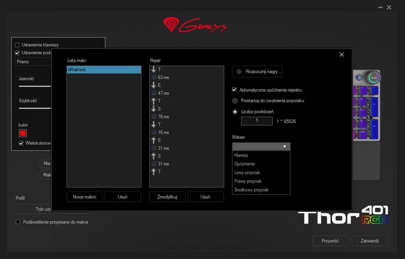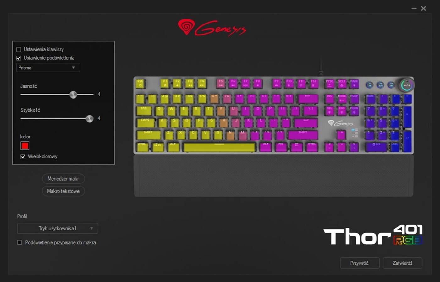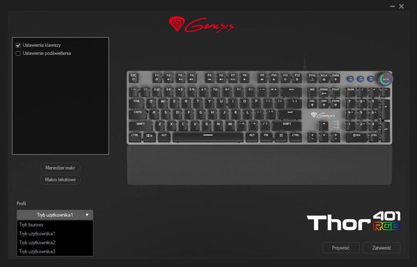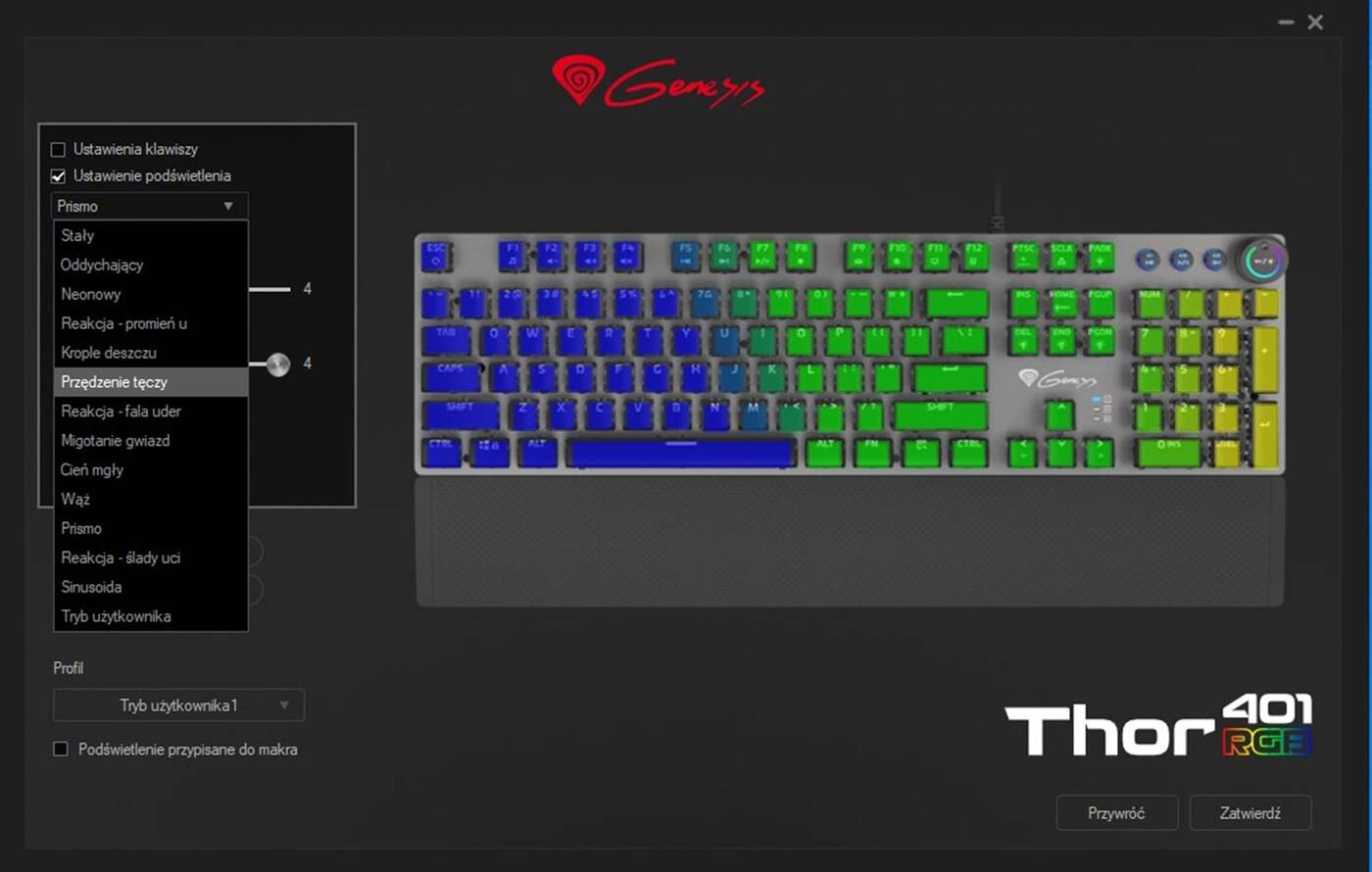 Jak na klawiaturę mechaniczną przystało, możecie liczyć na pełny N-Key rollover oraz Anti-Ghosting. Spokojnie możecie spać też w kwestii makr, czy przypisań klawiszy, bo Genesis zapewnia nam prostą aplikację do zarządzania Thor 400 RGB. W niej pobawimy się z podświetleniem, ustawimy profile użytkownika (te zapisują się w pamięci klawiatury), czy zadbamy o proste makra. Aplikacji jednak zdecydowanie nie potrzebujecie, bo ta klawiatura posiada rozbudowane centrum dowodzenia już z poziomu samych klawiszy oraz ich funkcji.