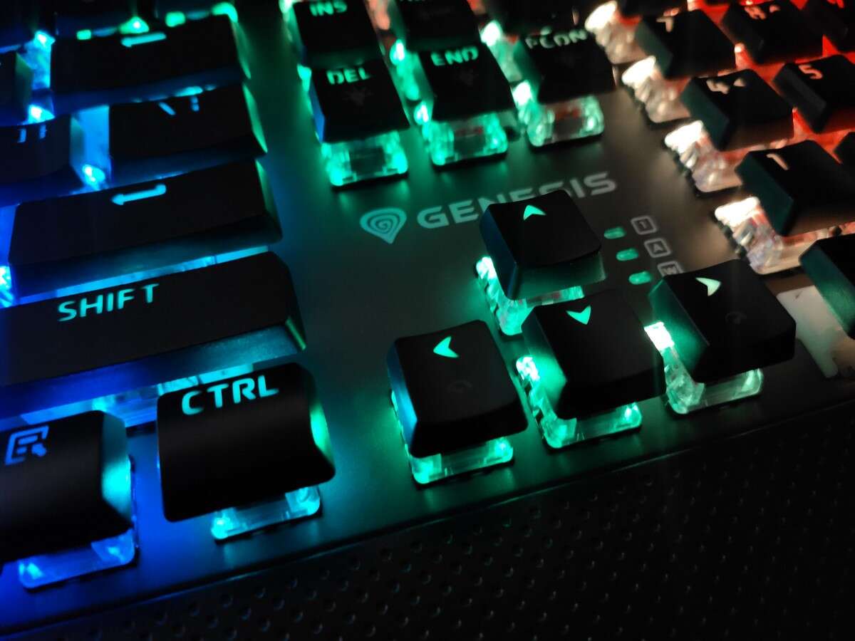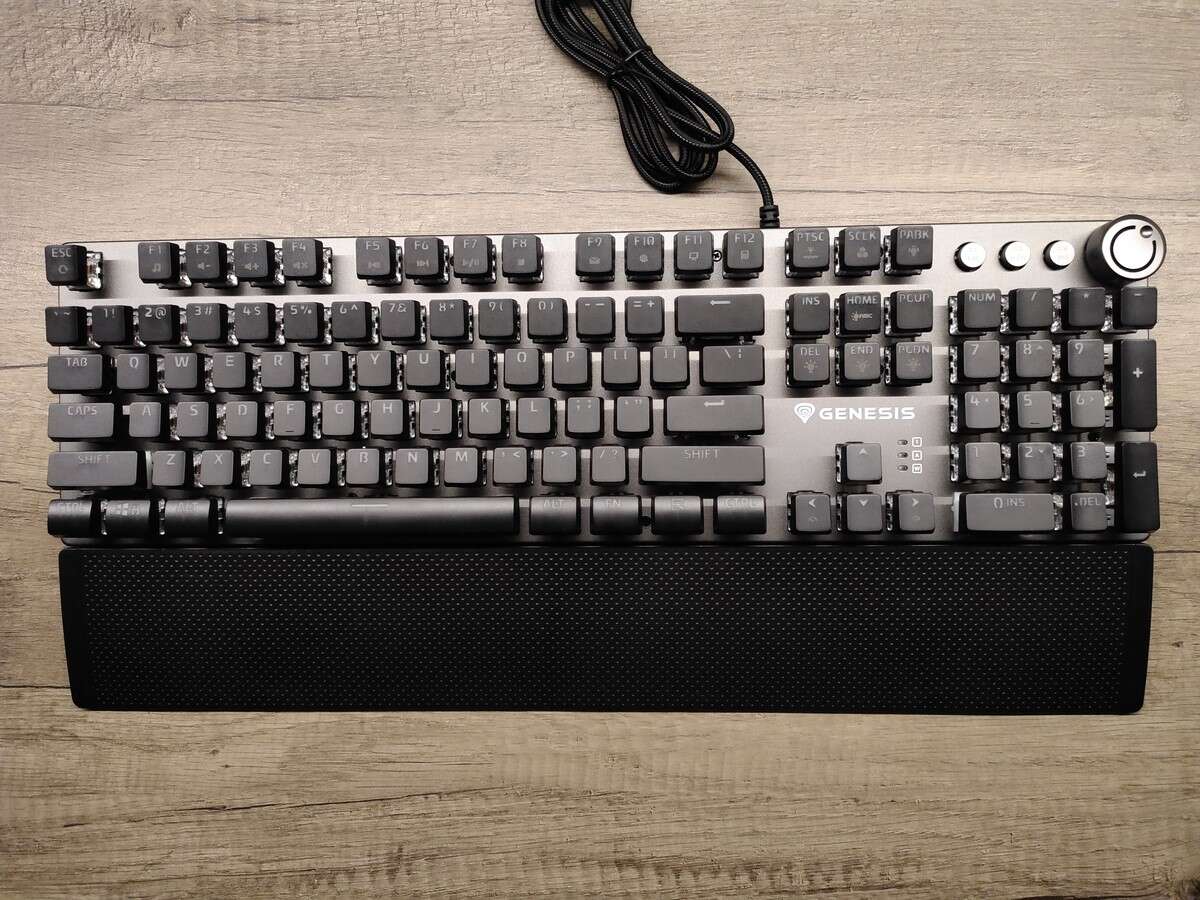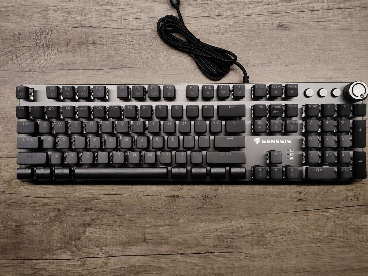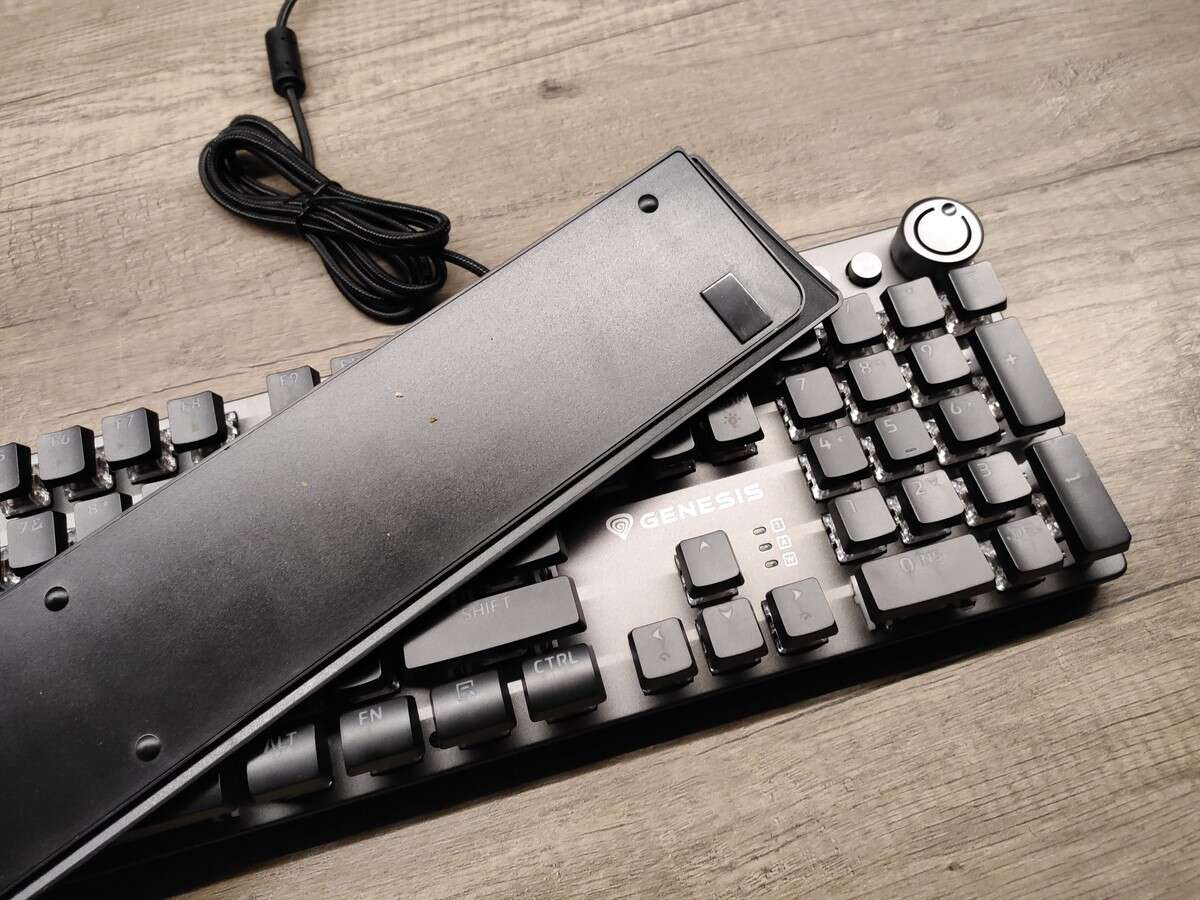Oczywiście Genesis nie zapewnił rynkowi całkowicie unikalnej klawiatury mechanicznej, ale wyróżnił się na tle konkurencji zarówno formatem (obudowa praktycznie zlicowana z krawędziami klawiszy), jak i dodatkiem trzech oddzielnych przycisków multimedialnych, którym towarzyszy pokrętło. Ten dodatek wypchnął diody sygnalizujące o aktywnym Caps- i Numlocku oraz trybie gamingowym (z zablokowanym klawiszem Windows) na miejsce przy samych strzałkach, gdzie znalazła się też biała nazwa i logo producenta.