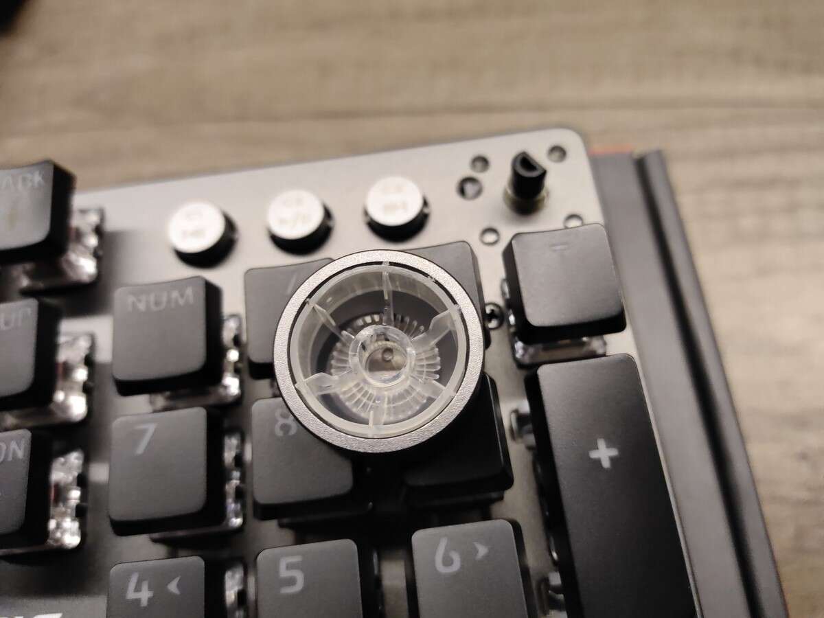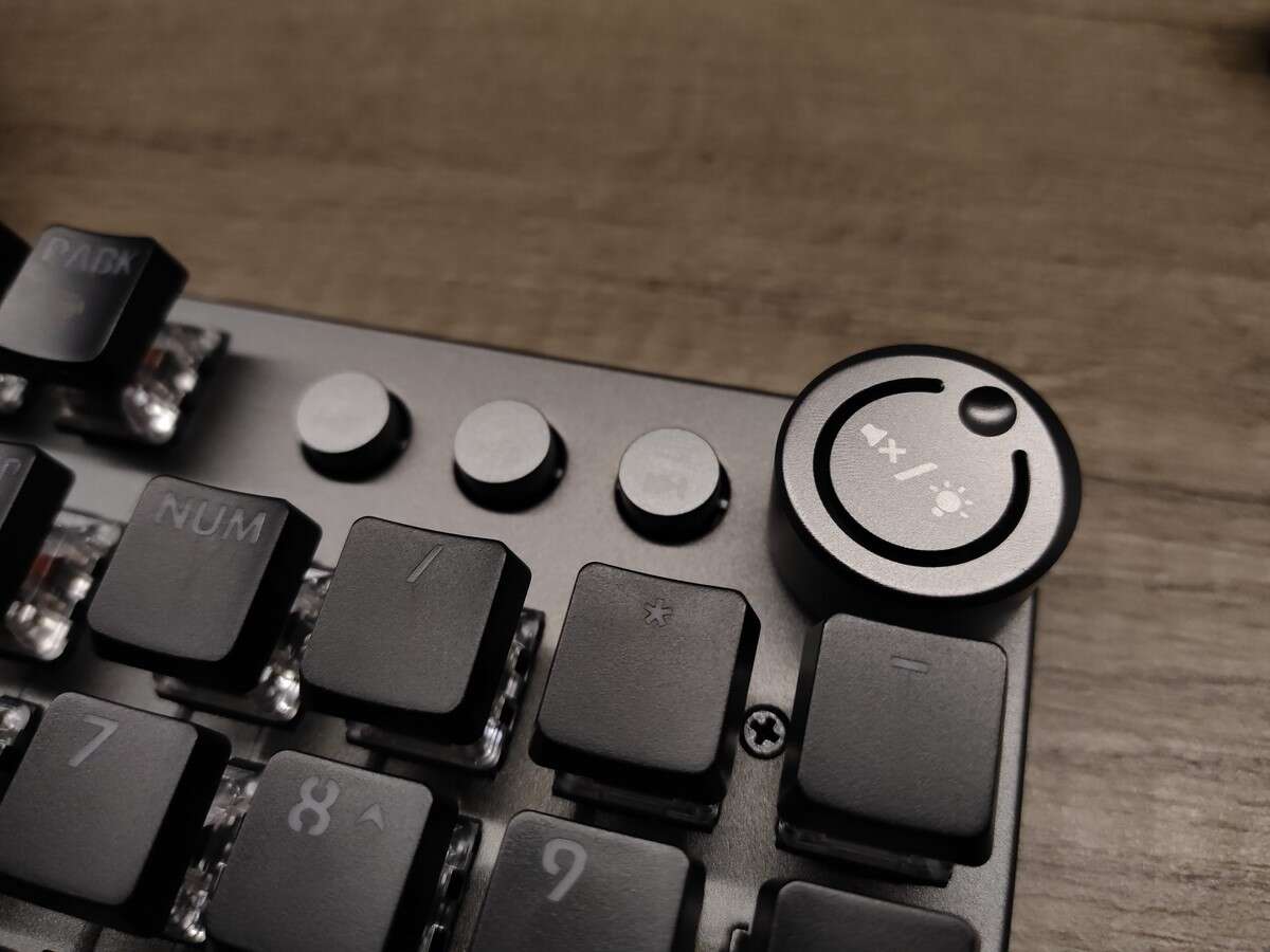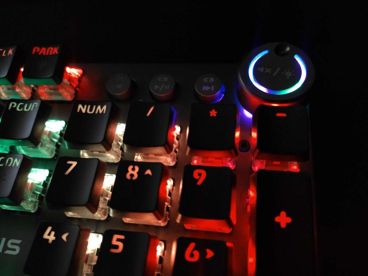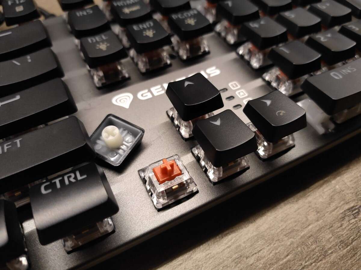 Oczywiście Genesis nie zapewnił rynkowi całkowicie unikalnej klawiatury mechanicznej, ale wyróżnił się na tle konkurencji zarówno formatem (obudowa praktycznie zlicowana z krawędziami klawiszy), jak i dodatkiem trzech oddzielnych przycisków multimedialnych, którym towarzyszy pokrętło. Ten dodatek wypchnął diody sygnalizujące o aktywnym Caps- i Numlocku oraz trybie gamingowym (z zablokowanym klawiszem Windows) na miejsce przy samych strzałkach, gdzie znalazła się też biała nazwa i logo producenta.