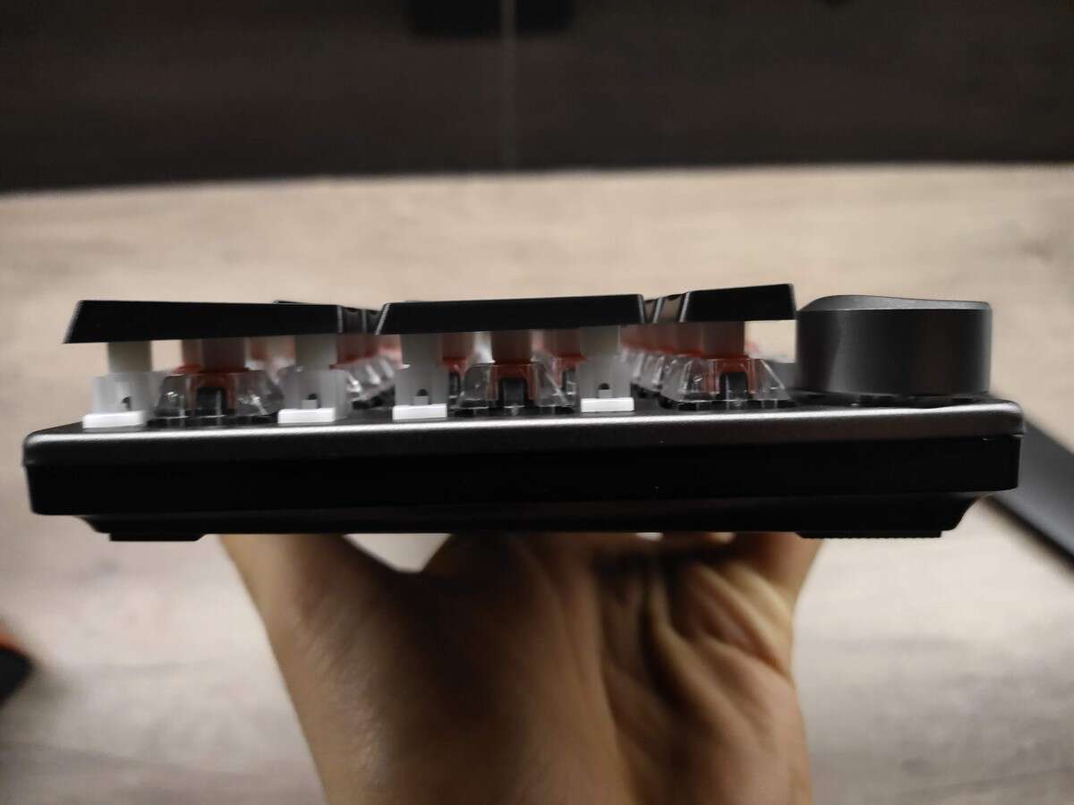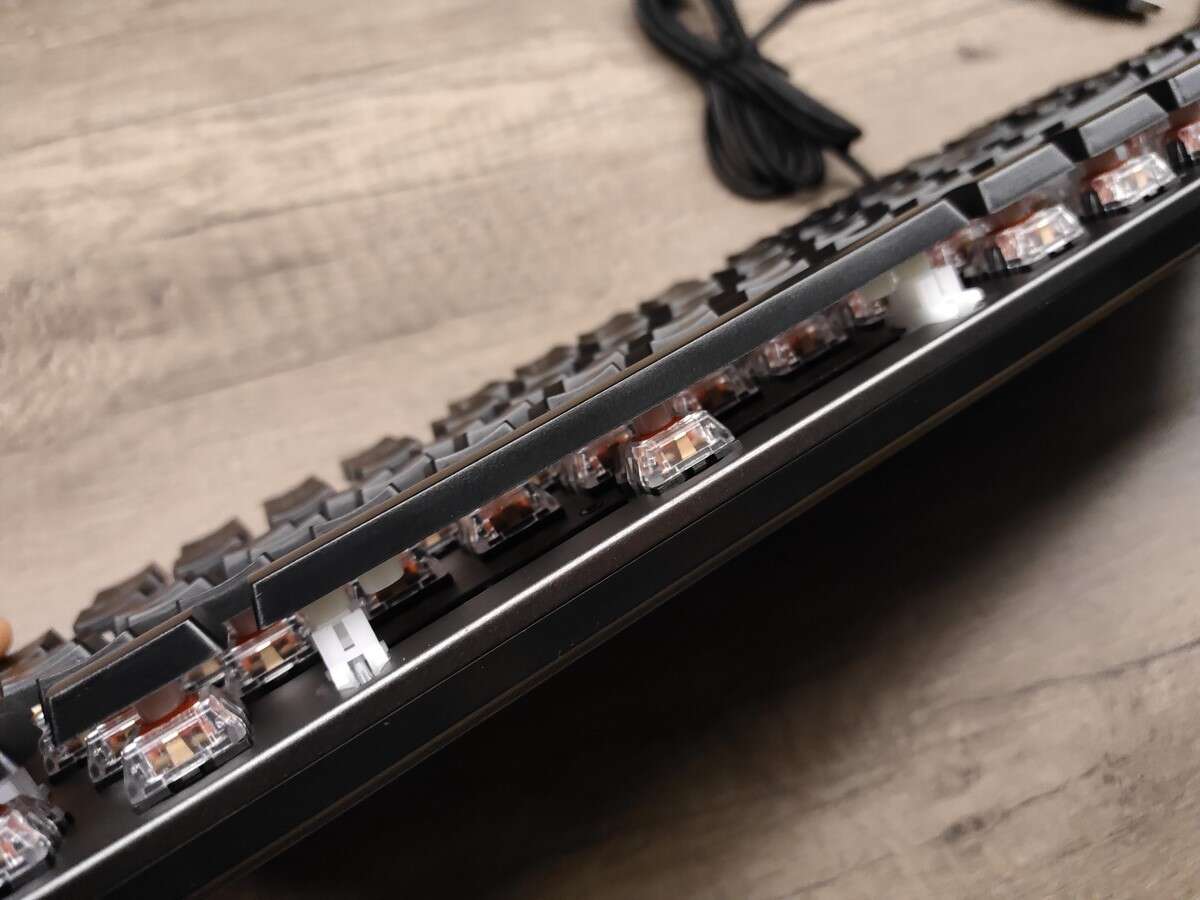 Wspomniane klawisze wykonano zgodnie z podejściem Dual Injection (wykorzystaniu dwóch stopionych ze sobą warstw) i „ścięto” w pół. W ten sposób otrzymano ciekawe połączenie niskoprofilowych klawiszy w bądź, co bądź, pełnowymiarowej klawiaturze.