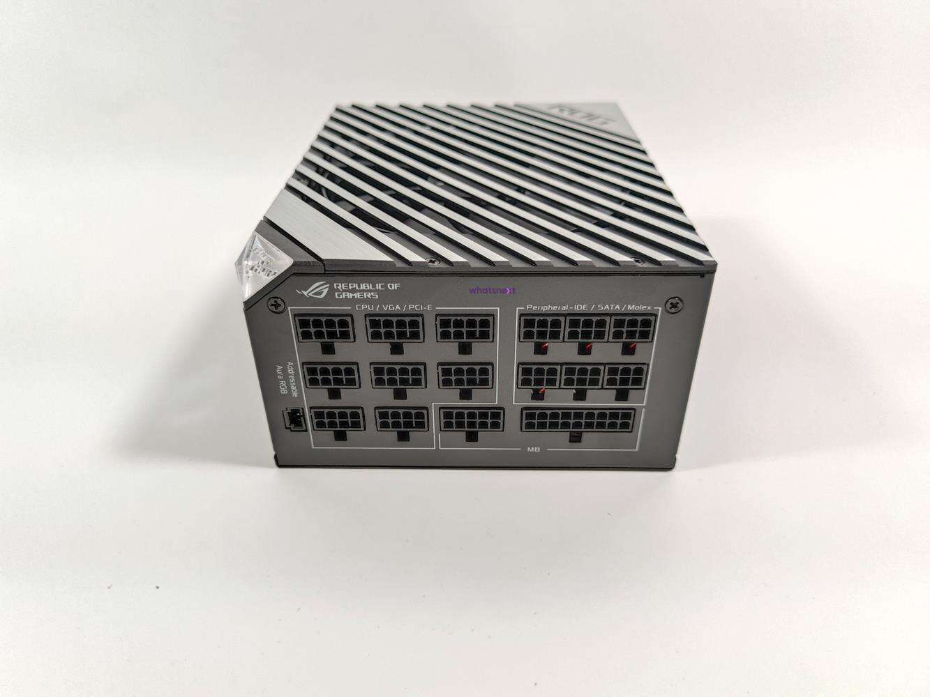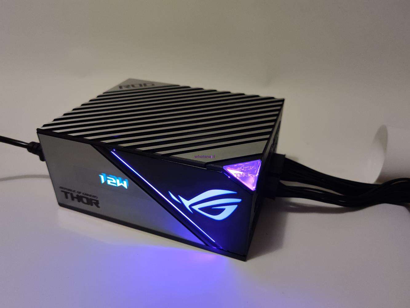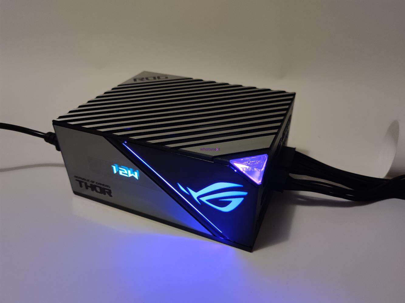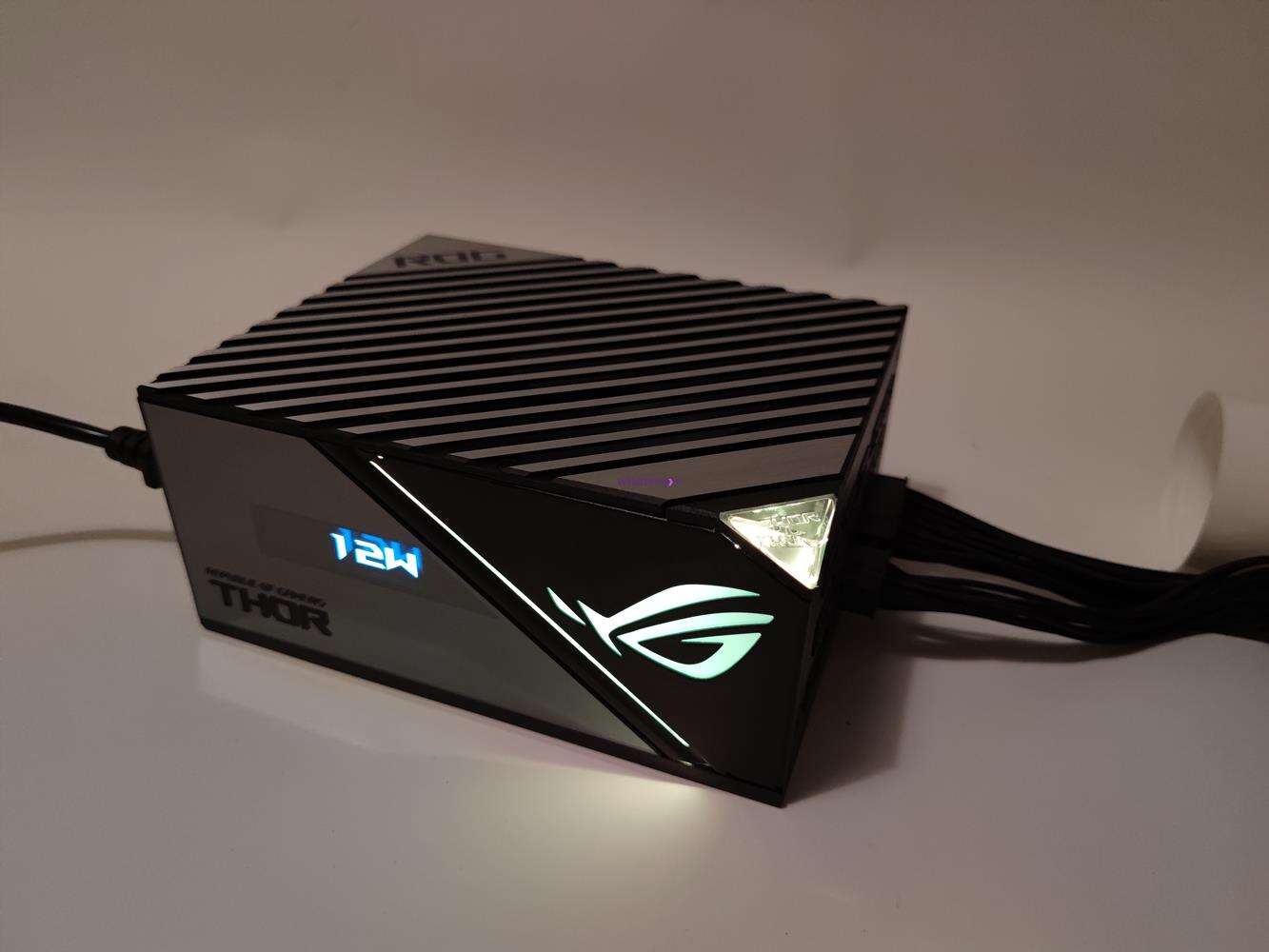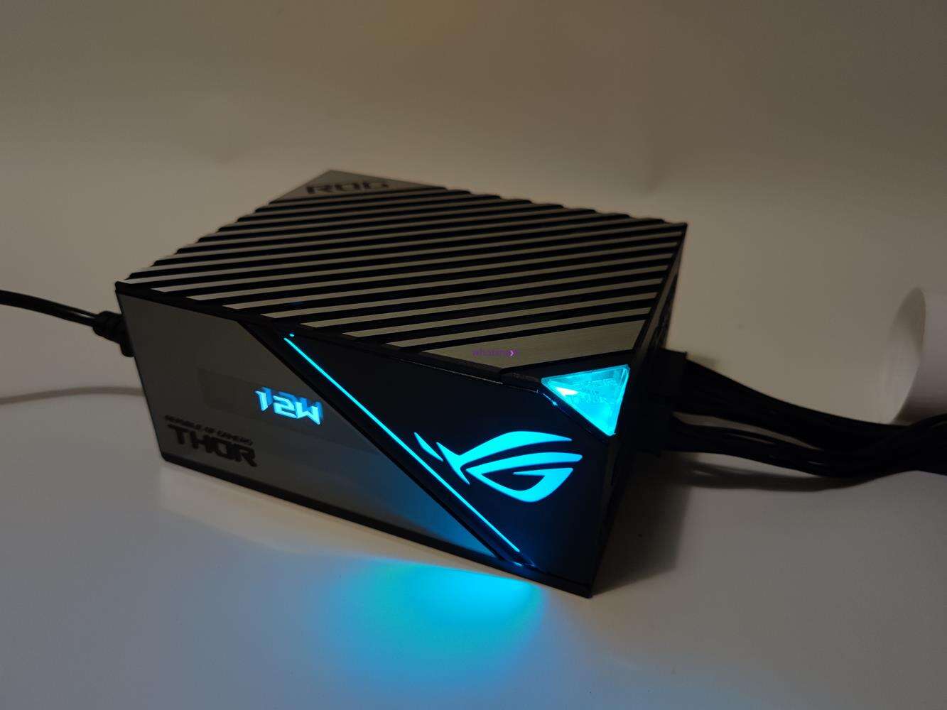 Asus ROG Thor 1000W Platinum II wygląda dobrze, a na tle konkurencji wyróżnia go podświetlenie ARGB i wyświetlacz OLED. Ten ostatni pokazuje tylko aktualnie pobieraną moc, a podświetlenie można zsynchronizować z płytą główną. Ogromną wadą tego rozwiązania jest jego umieszczenie tylko z jednej strony. Jeśli zasilacz zamontujecie w obudowie wentylatorem w dół to znajdzie się ono od strony, na której zazwyczaj znajduje się blacha. Nie będzie więc tak naprawdę żadnego zysku z tego rozwiązania.