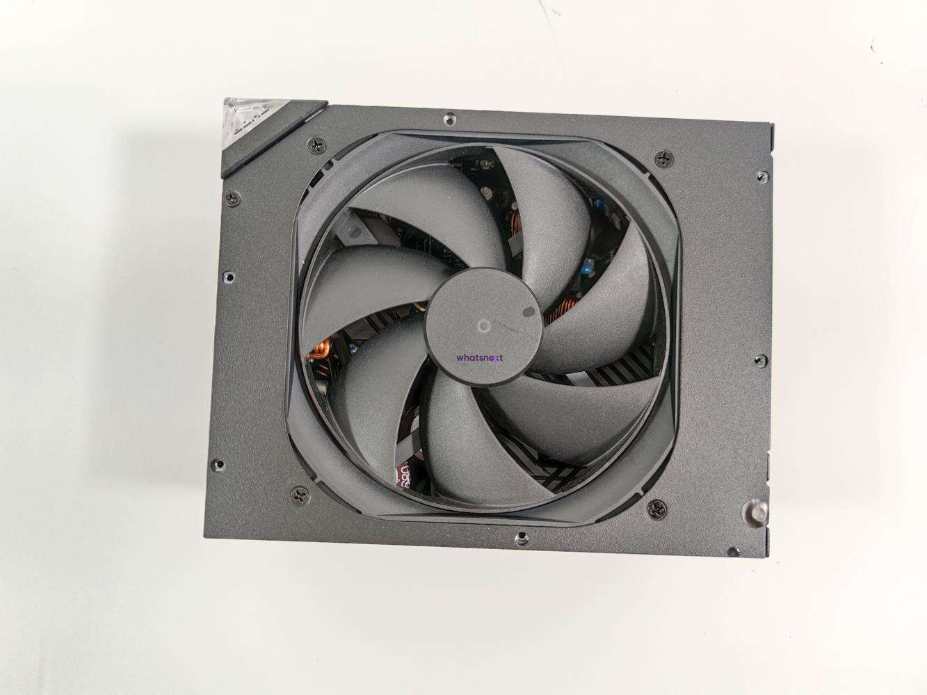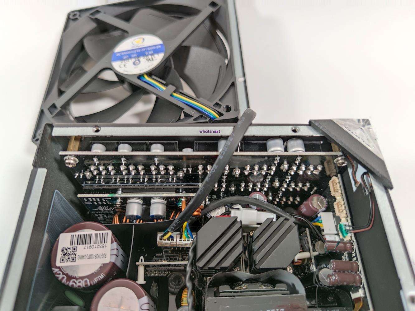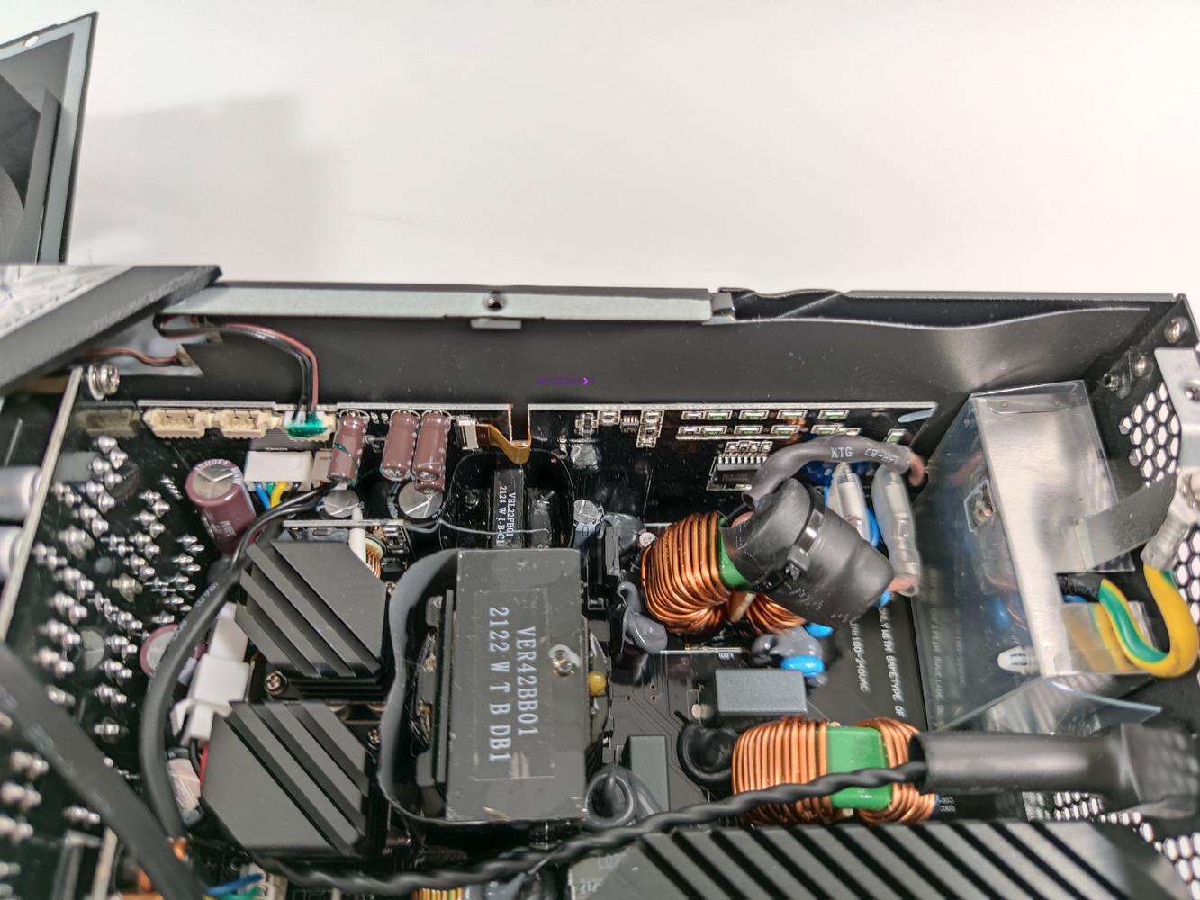 Za wnętrze najpewniej odpowiada Seasonic (seria Prime Ultra) więc jakość bez wątpienia jest najwyższa. Widać tutaj dobre wykonanie oraz sporej wielkości radiatory. Dwa największe kondensatory są produkcji Nippon Chemi-Con. Mogą one pracować w temperaturze do 105°C. Ich parametry to 420 V, 680 uF oraz 420 V, 390 uF. Nie zabrakło też zabezpieczeń: zabezpieczenie nadprądowe (OCP), zabezpieczenie nadnapięciowe (OVP), zabezpieczenie podnapięciowe (UVP), zabezpieczenie nadmocowe (OPP), zabezpieczenie przed nadmierną temperaturą (OTP), zabezpieczenie przed zwarciem (SCP).