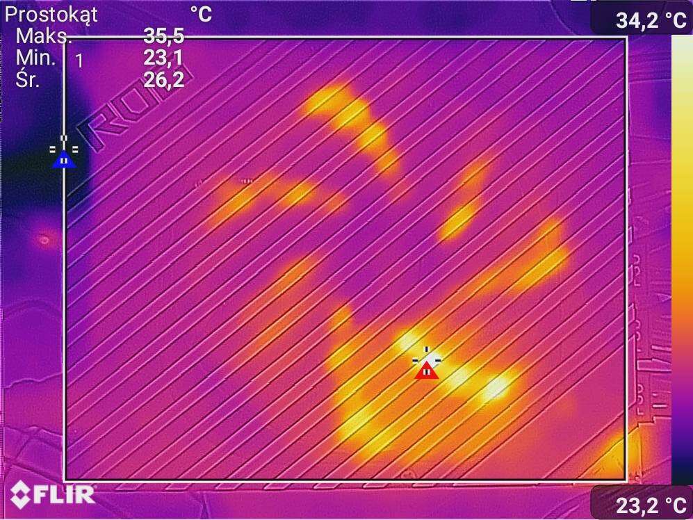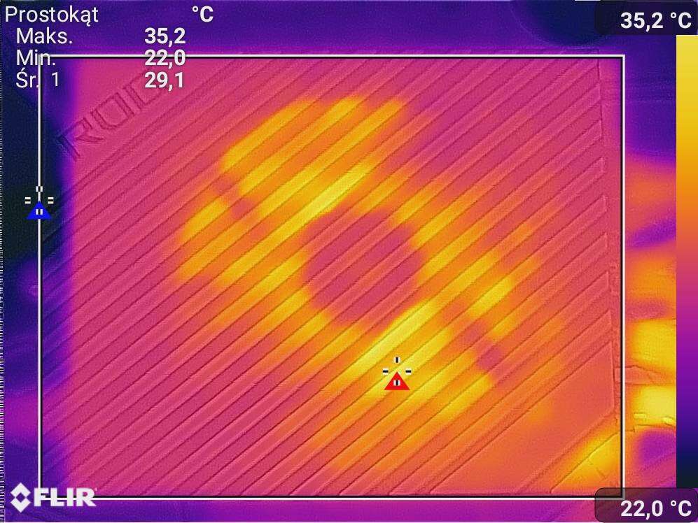 Spoczynek polegał tylko na wyświetlaniu pulpitu. Obciążenie to FurMark + Cinebench R23. W testach temperatury wykorzystałem moduł termowizyjny smartfonu CAT S61.