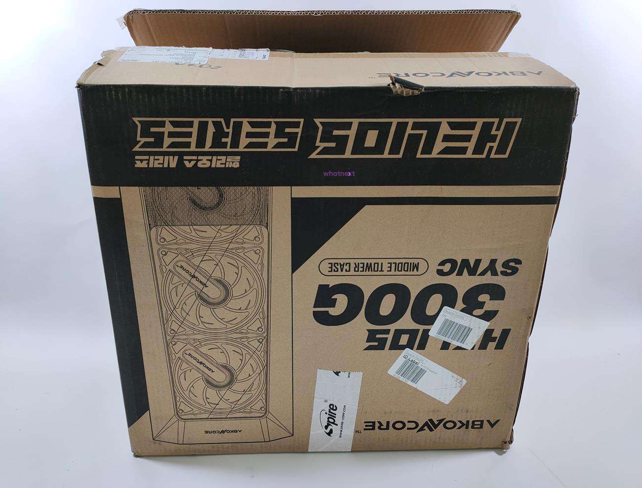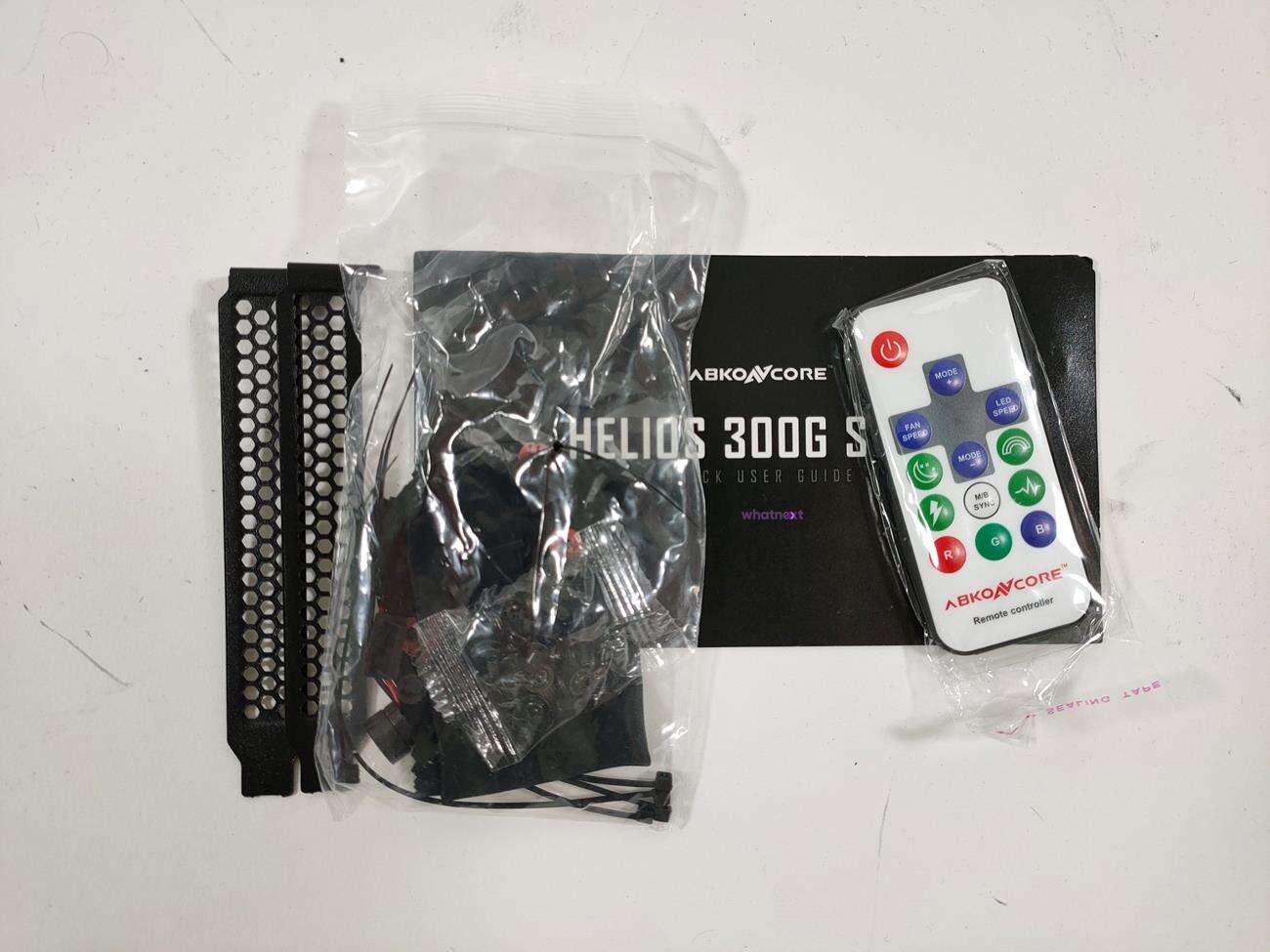 Obudowę otrzymałem w standardowym kartonie. Wraz z Abkoncore Helios 300G Sync w środku znajduje się instrukcja, śrubki, dwie zaślepki PCI oraz pilot do sterowania ARGB. Działa on bezprzewodowo na WiFi – nie trzeba wiec celować w żadne miejsce na obudowie. Nie ma problemów z zasięgiem czy zmianą podświetlenia – wszystko śmiga jak należy.