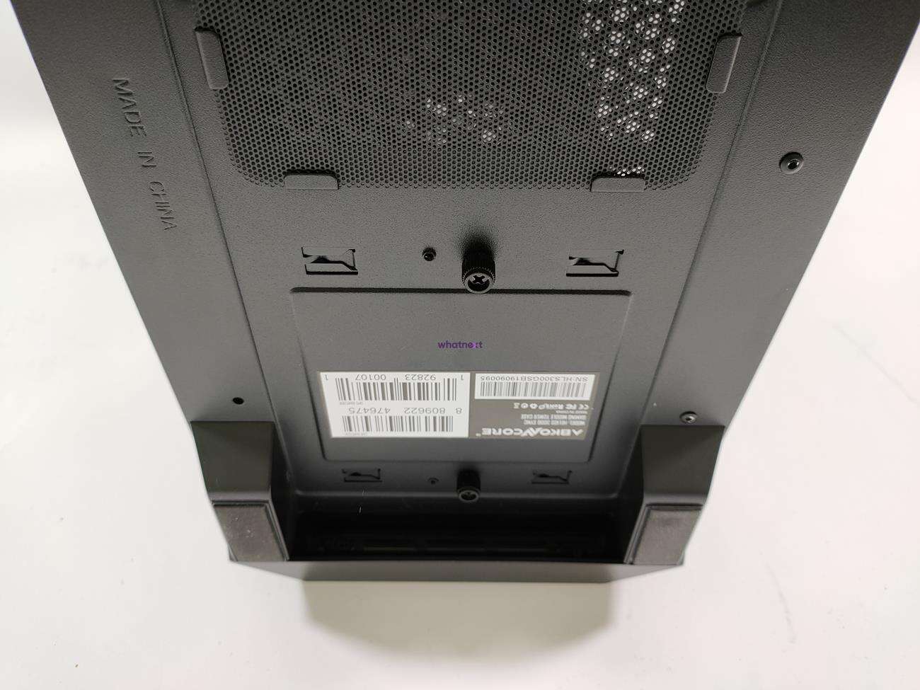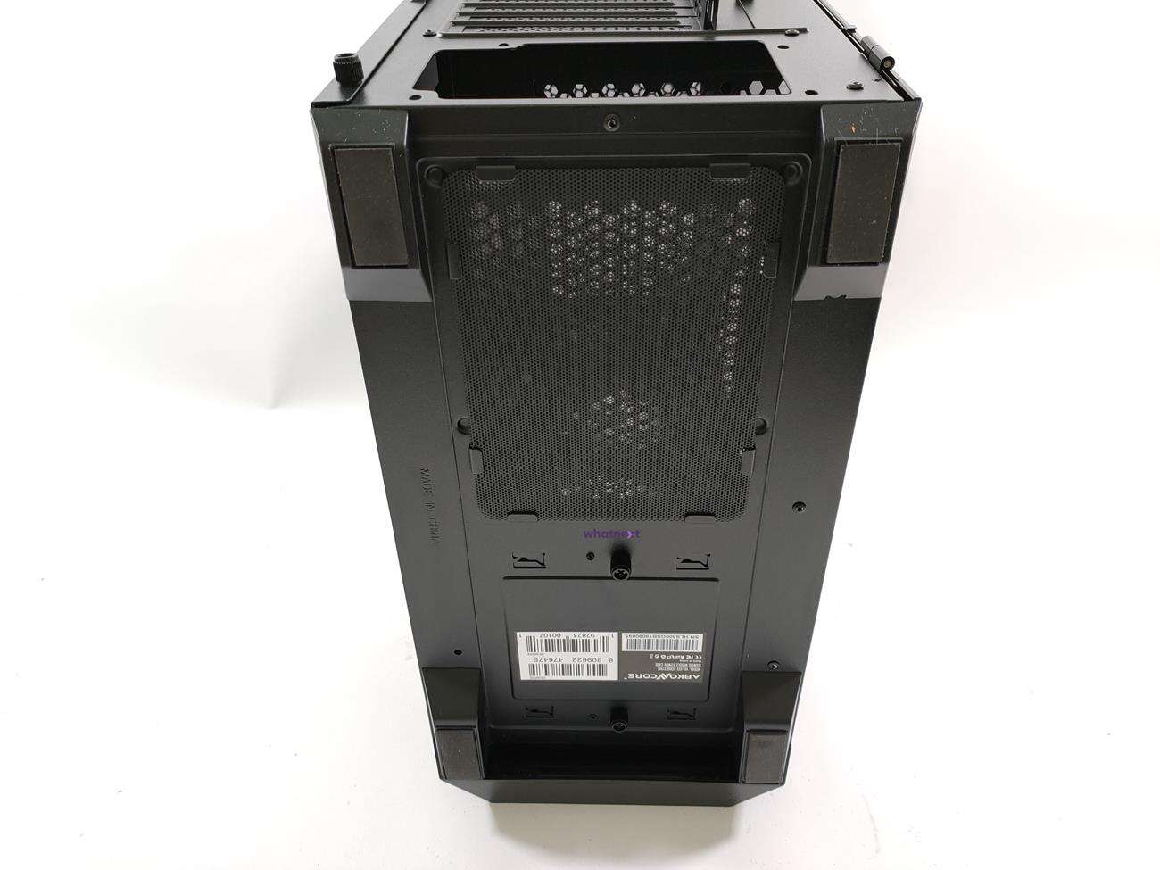 Abkoncore Helios 300G Sync stoi na czterech nóżkach – obudowa ślizga się po panelach. Pod zasilaczem widać filtr przeciwkurzowy, który będzie ciężki do konserwacji.
