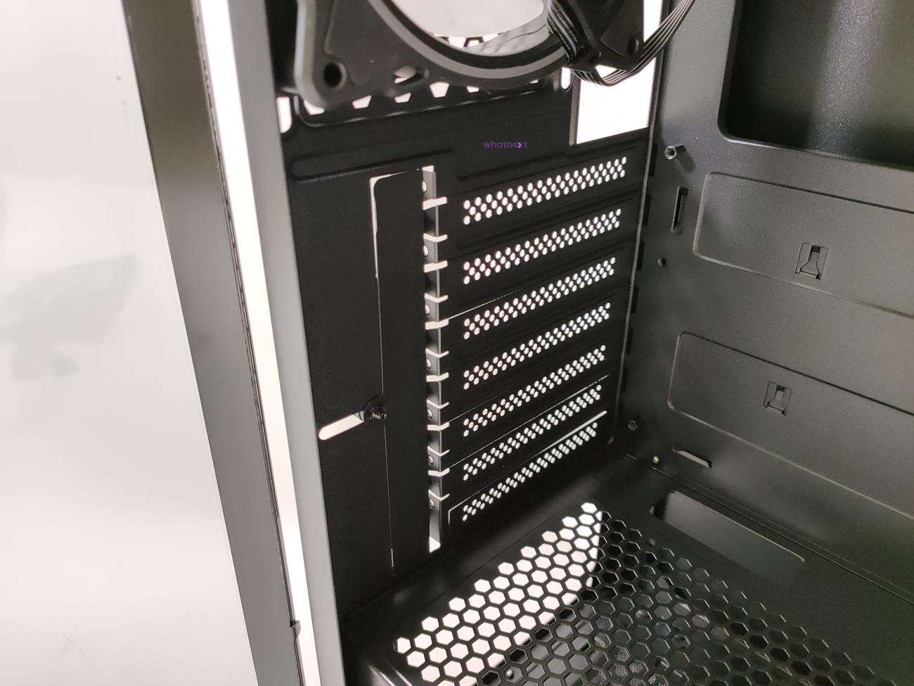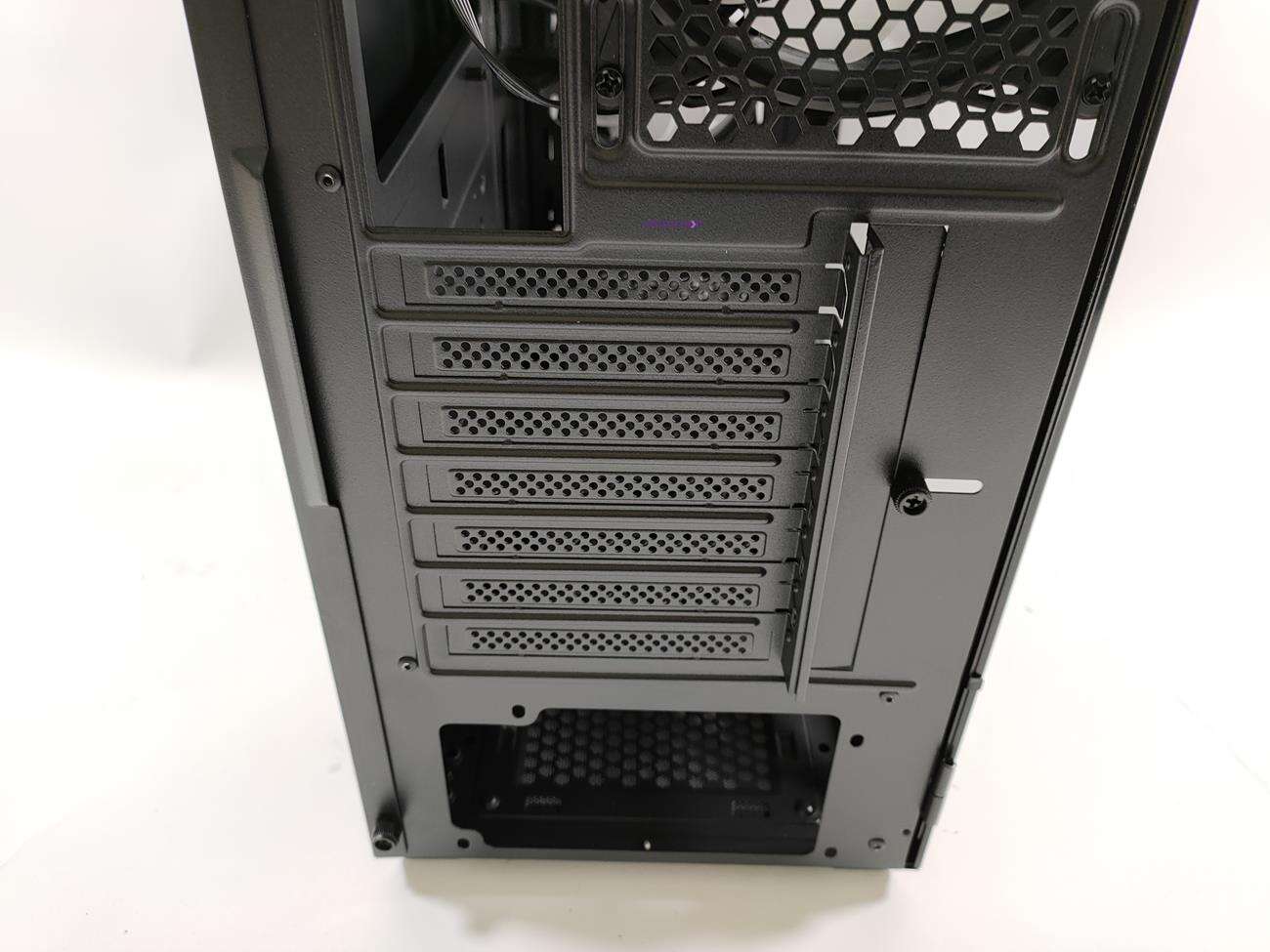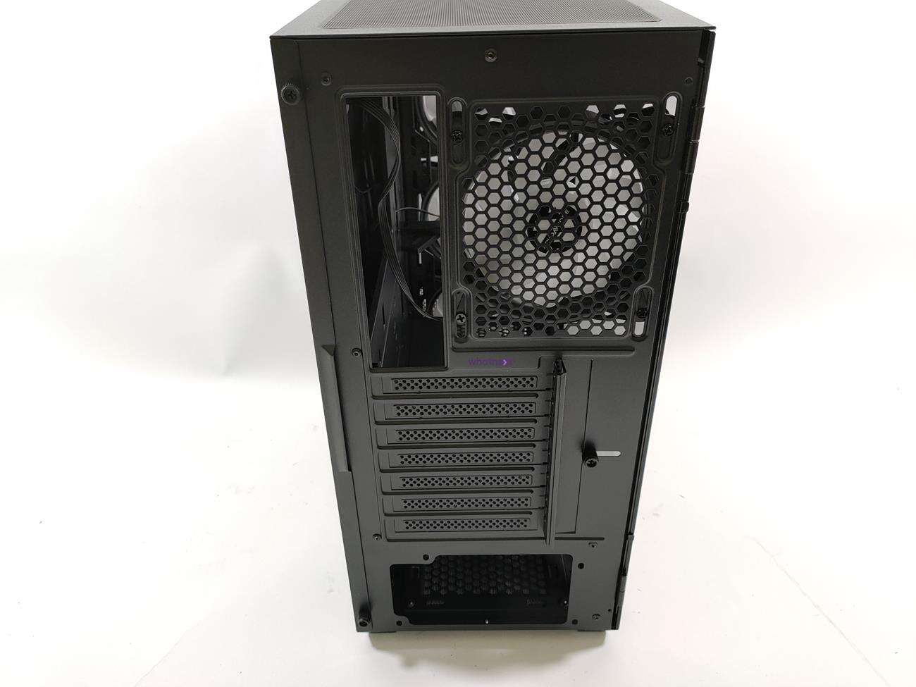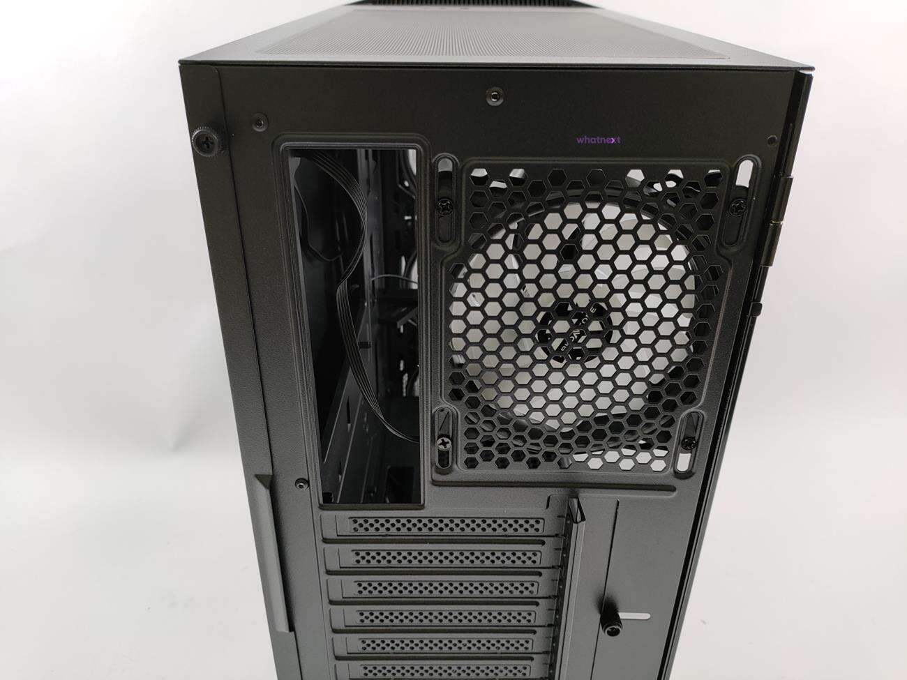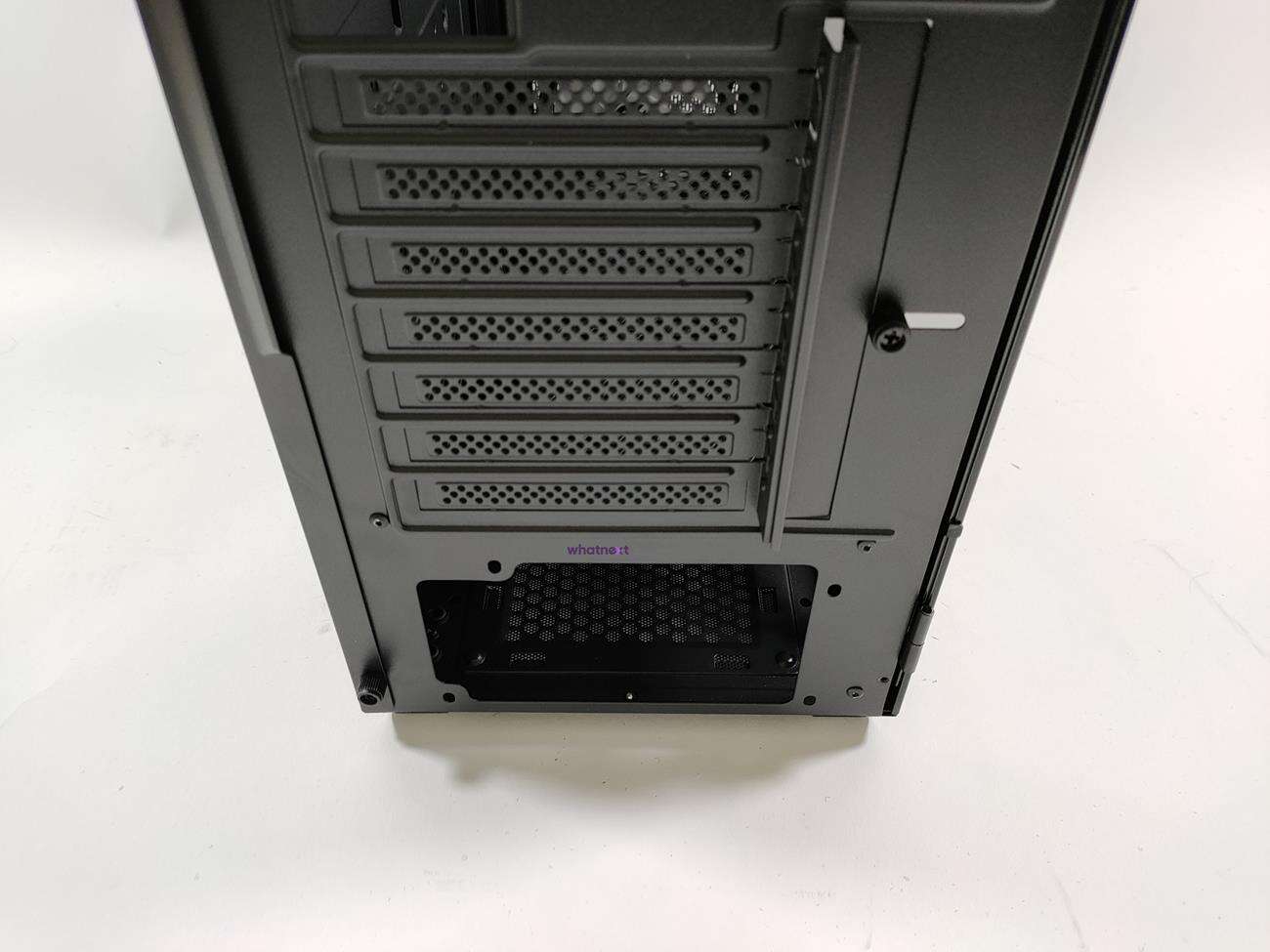 Tył jest bez zaskoczeń. Na górze jest wentylator – model ten sam co z przodu. Niżej widać 7 wyłamywanych zaślepek PCI. Biorąc pod uwagę, że dwie stałe zaślepki są dołączone to nie jest aż tak źle.