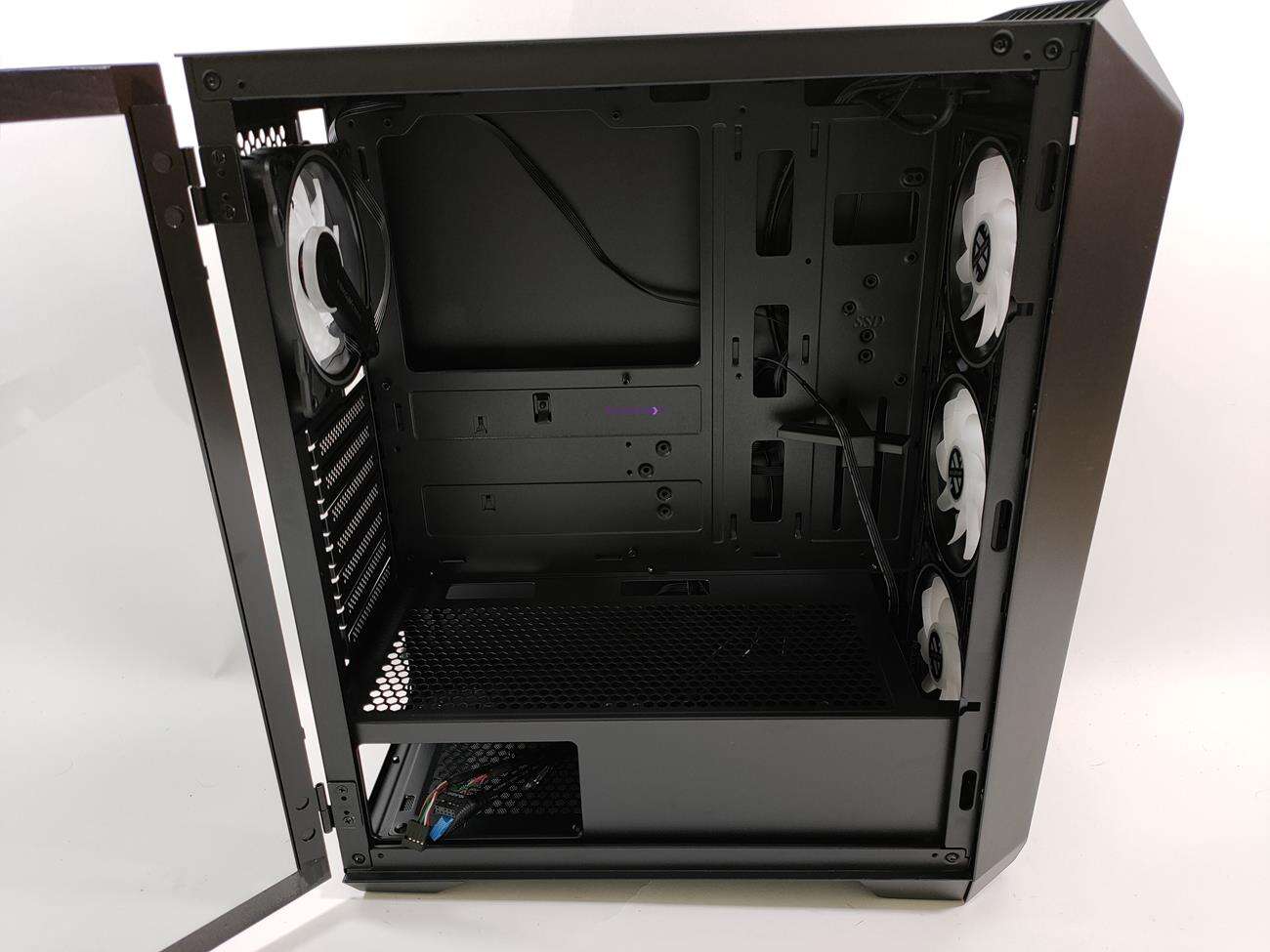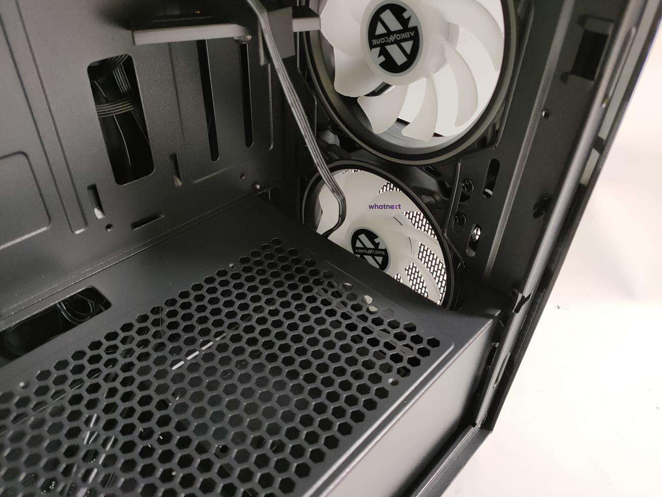 Abkoncore Helios 300G Sync oczywiście ma piwnicę. Jest w niej wycięcie na zasilacz, przednią chłodnicę czy otwory wentylacyjne. Można też tutaj zamontować dwa wentylatory 120 mm. Nie zabrakło też miejsca na przeciągnięcie okablowania.