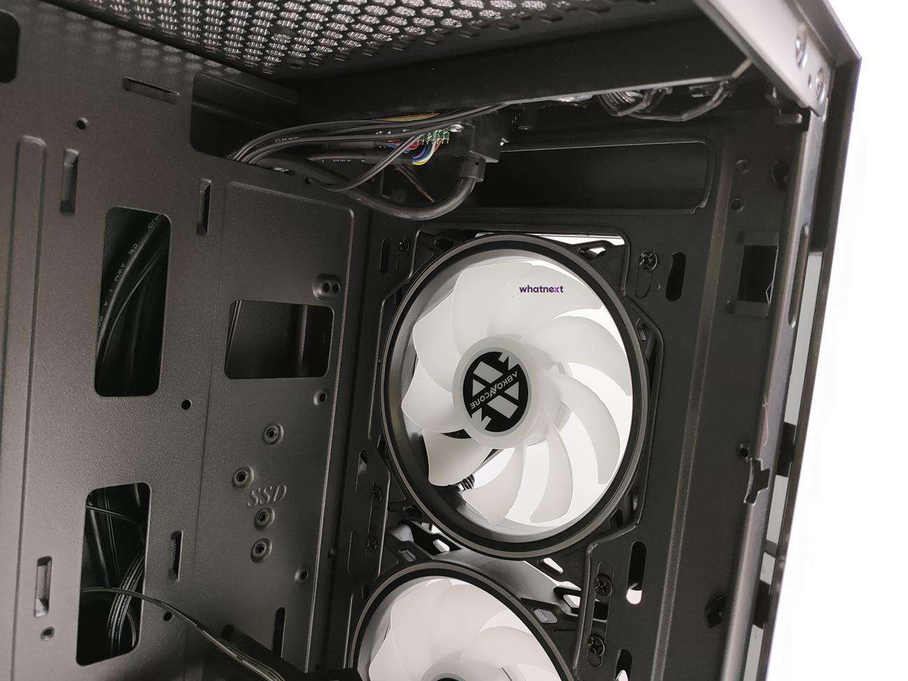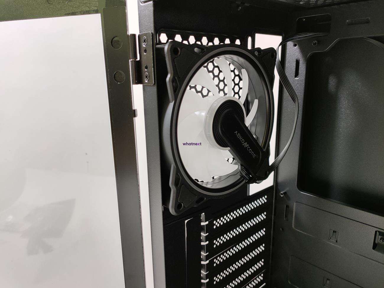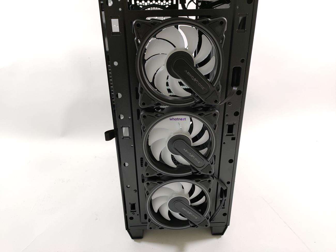 Po zdjęciu przedniego panelu możecie zobaczyć trzy 120 mm wentylatory HR120. Są one dosyć nietypowe – mają pasek z logiem firmy, ale wyglądają fenomenalnie. Ich maksymalna prędkość wynosi 1300 RPM, przepływ powietrza 382, CFM, ciśnienie 1,3 mmH2O a głośność 25 dBA. Wentylatory mają 6 pinowe wyjścia, które podłączone są do kontrolera umieszczonego z tyłu obudowy.