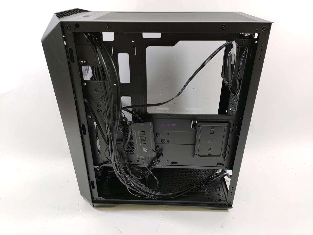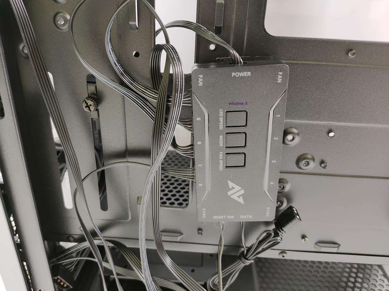 Z tyłu jest jeszcze jedna ciekawa rzecz – kontroler. Można go podłączyć do złącza ARGB 5V na płycie głównej i sterować podświetleniem za pomocą oprogramowania. Na kontrolerze są też przyciski pozwalające na sterowanie wentylatorami czy podświetleniem. Są również jeszcze dodatkowe miejsce na wentylatory 6 pin. Wadą kontrolera jest zasilanie ze złącza Molex, a nie SATA.