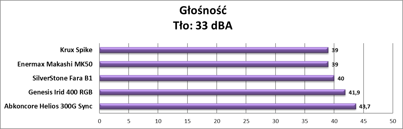 - Głośność zmierzyłem przy zamkniętej obudowie z odległości 20 cm od środka lewego boku – tło wynosiło 33 dBA.