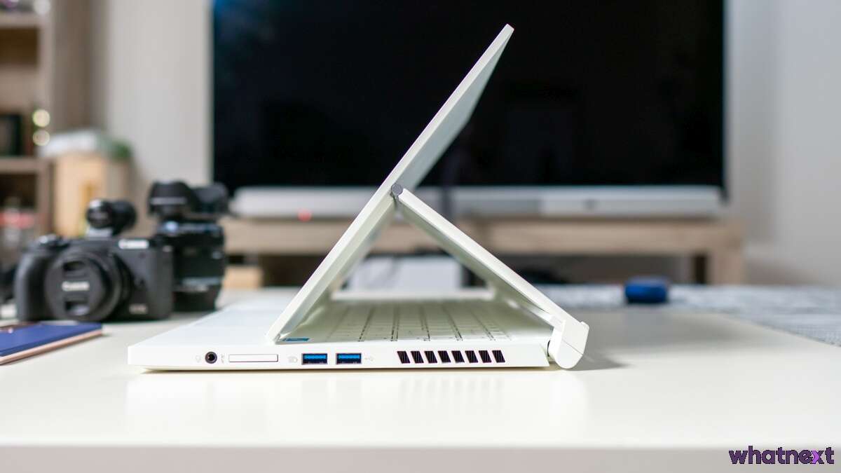 Ekran laptopa to rozwinięcie konstrukcji konwertowalnych. Z tą różnicą, że ekran nie obraca się dookoła obudowy o 360 stopni. Ale nadal można postawić go w pozycji namiotu lub nieco grubszego tabletu.