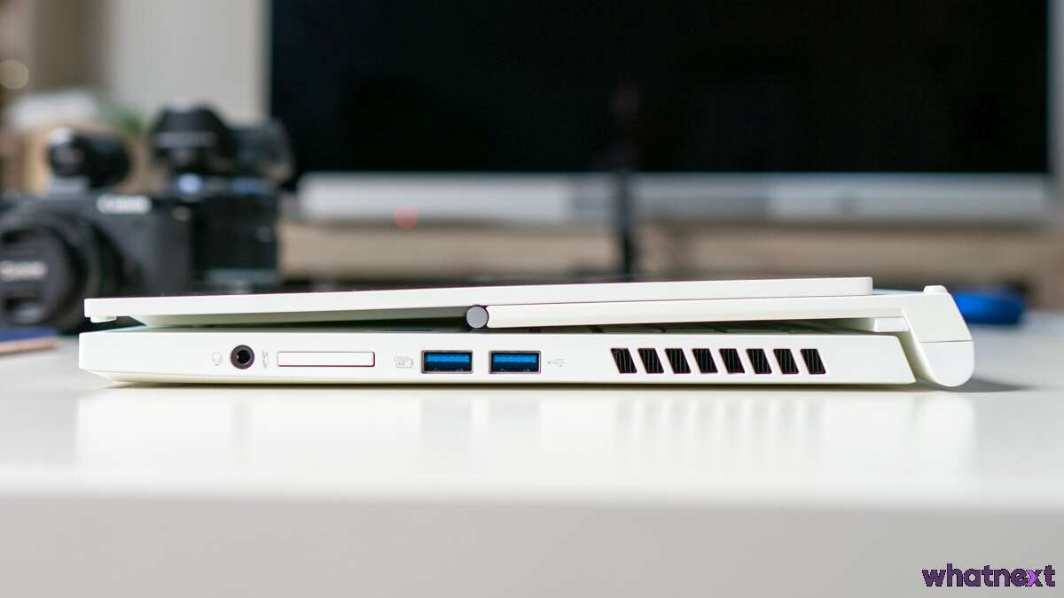 Acer zafundował nam w ConceptD 3 Ezel sporo portów. Na prawym boku mamy dwa duże porty USB, gniazdo kart SD oraz Jack 3,5mm. Gniazdo kart jest zaślepione plastikową atrapą karty SD i gdybym miał używać laptopa gdzieś na wyjeździe, zostawiłbym zaślepkę w domu. Na 100% bym ją zgubił przy okazji manewrowania kartami.