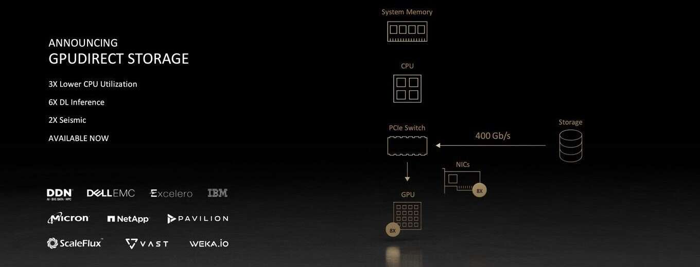 Co ciekawe, NVIDIA ogłosiła przy okazji swoją nową funkcję w postaci GPUDirect Storage, która jest podobna do konsumenckiej technologii Microsoft DirectStorage. Znamy ją z zapewniania rdzeniowi graficznemu danych prosto z szybkiego dysku NVMe z pominięciem procesora, co może przyspieszyć ładowanie w przypadku niektórych obciążeń. To samo najwidoczniej wykorzystują profesjonalne karty z GPUDirect Storage, ale oczywiście przyspieszają nie tyle ładowanie się tekstur i menu w grach, a coś „swojego”.