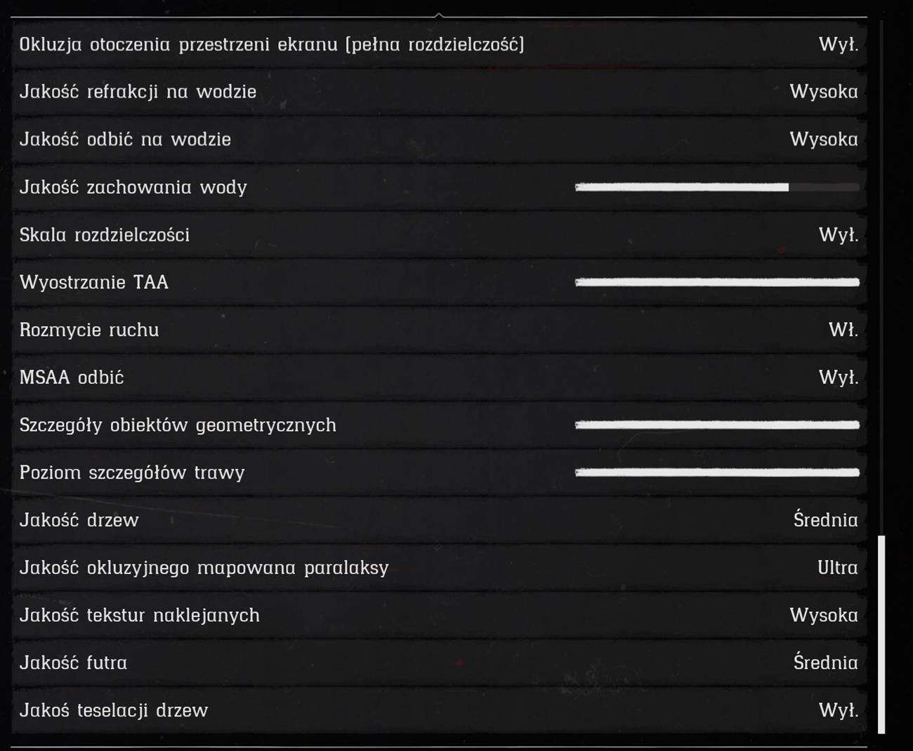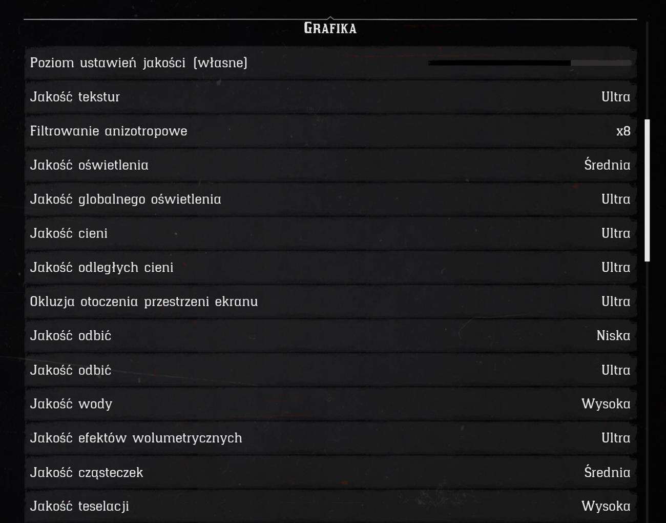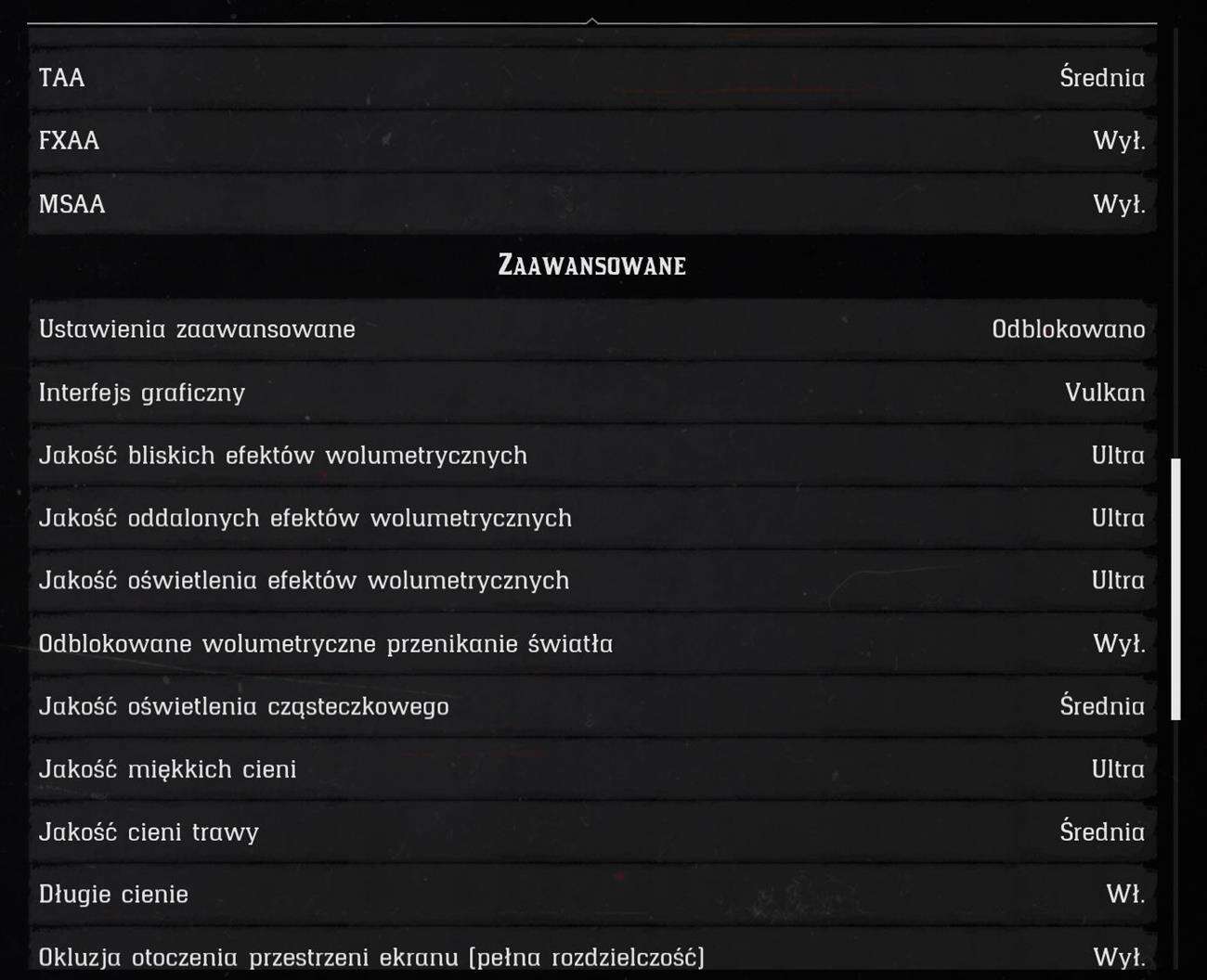 Metro Exodus (DirectX 12) każdy z Was zna bardzo dobrze. Gra na ustawieniach Ultra bardzo mocno obciąża sprzęt i takie zostały wybrane we wbudowanym benchmarku. Red Dead Redemption 2 (Vulkan) to kolejny tytuł, który jest bardzo wymagający. Wybrane ustawienia są pokazane na poniższych screenach – jedynie w przypadku kart o pamieć VRAM równej 4 GB zmieniłem też jakość cieni na wysokie.