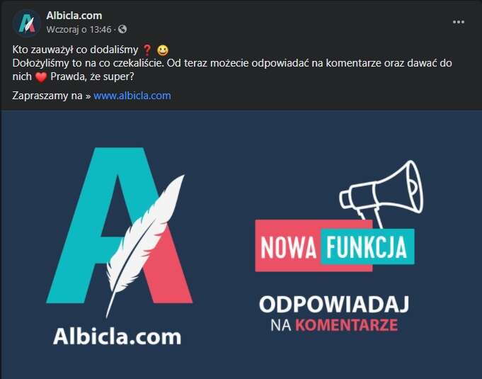 Patrząc na sam wpis Albicli można byłoby oczekiwać czegoś naprawdę super, zwłaszcza, ze sami to sugerują. Tylko, że chodzi o możliwość odpowiadania na komentarze, co dla nikogo, kto korzysta z Facebooka, Twittera, Instagrama i innych podobnych serwisów nie jest czymś szczególnym. Ot, funkcja, która po prostu powinna być. Podobnie jak możliwość otrzymywania powiadomień.
