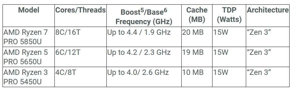 Najmocniejszym modelem będzie AMD Ryzen 7 PRO 5850U. Ma on mieć 8 rdzeni, 16 wątków oraz oferować do 23% większą wydajność w domu i biurze niż konkurencja. Procesor został też zbudowany z myślą o całodniowej pracy na baterii – ma on zapewniać nawet do 17,54 godziny pracy na jednym ładowaniu. Na rynek trafią też modele Ryzen 5 PRO 5650U oraz Ryzen 4 PRO 5450U.